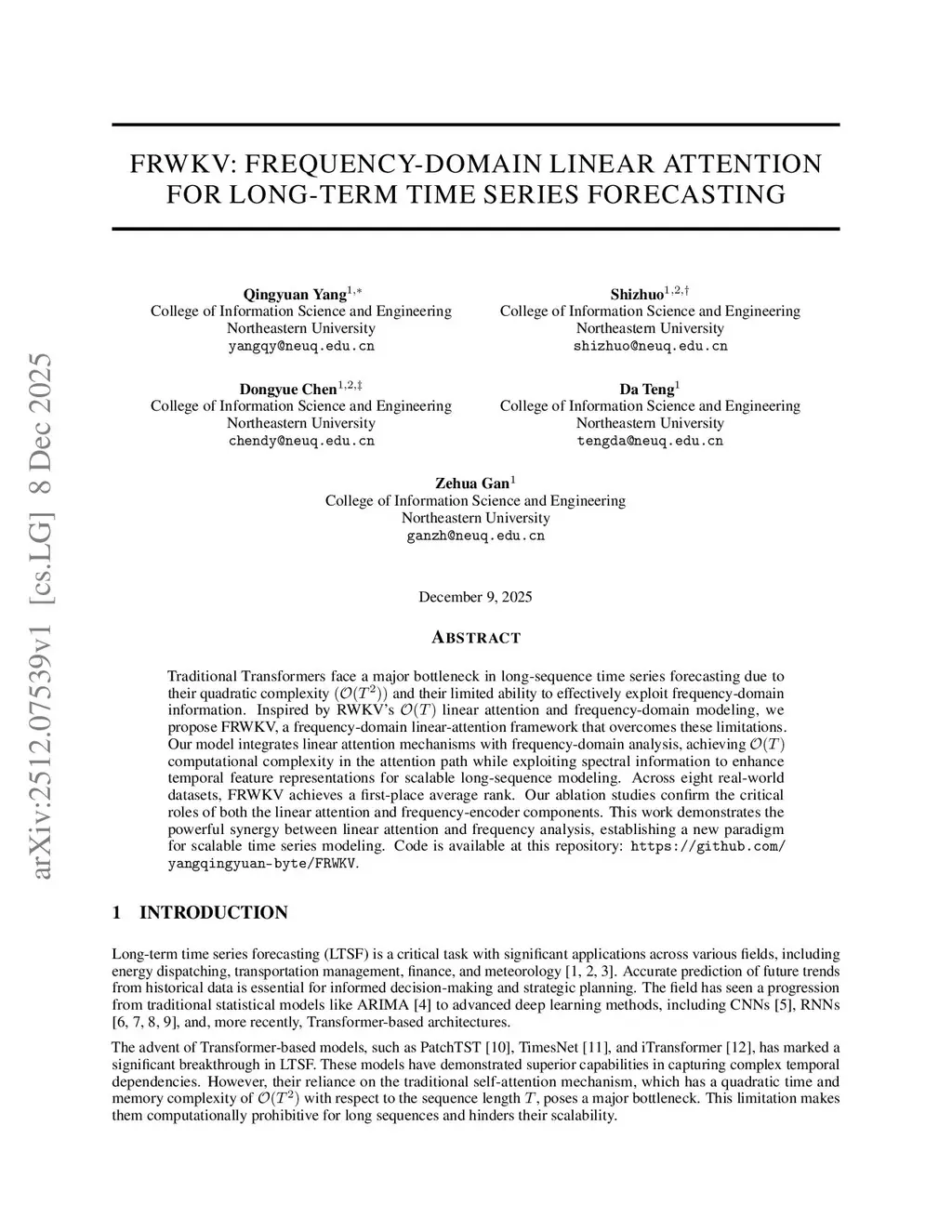 Traditional Transformers face a major bottleneck in long-sequence time series forecasting due to their quadratic complexity and their limited ability to effectively exploit frequency-domain information. Inspired by RWKV's linear attention and frequency-domain modeling, we propose FRWKV, a frequency-domain linear-attention framework that overcomes these limitations. Our model integrates linear attention mechanisms with frequency-domain analysis, achieving computational complexity in the attention path while exploiting spectral information to enhance temporal feature representations for scalable long-sequence modeling. Across eight real-world datasets, FRWKV achieves a first-place average rank. Our ablation studies confirm the critical roles of both the linear attention and frequency-encoder components. This work demonstrates the powerful synergy between linear attention and frequency analysis, establishing a new paradigm for scalable time series modeling. Code is available at this repository: this https URL.