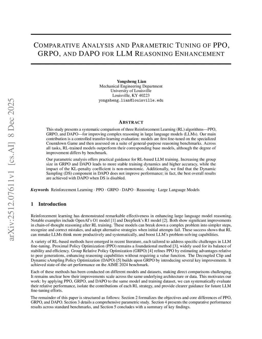 This study presents a systematic comparison of three Reinforcement Learning (RL) algorithms (PPO, GRPO, and DAPO) for improving complex reasoning in large language models (LLMs). Our main contribution is a controlled transfer-learning evaluation: models are first fine-tuned on the specialized Countdown Game and then assessed on a suite of general-purpose reasoning benchmarks. Across all tasks, RL-trained models outperform their corresponding base models, although the degree of improvement differs by benchmark.Our parametric analysis offers practical guidance for RL-based LLM training. Increasing the group size in GRPO and DAPO leads to more stable training dynamics and higher accuracy, while the impact of the KL-penalty coefficient is non-monotonic. Additionally, we find that the Dynamic Sampling (DS) component in DAPO does not improve performance; in fact, the best overall results are achieved with DAPO when DS is disabled.