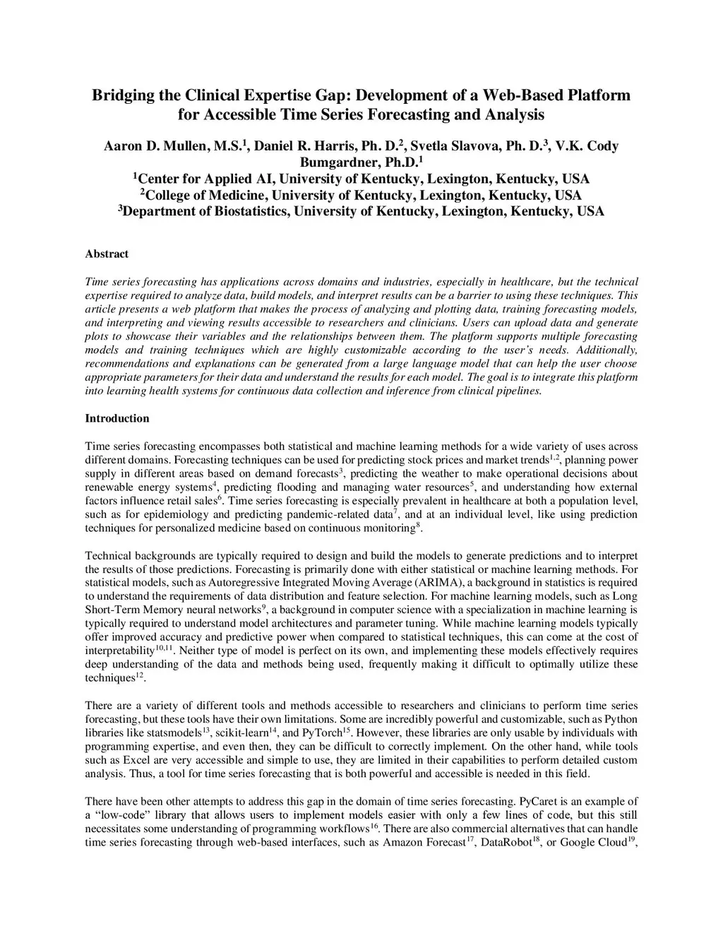 Time series forecasting has applications across domains and industries, especially in healthcare, but the technical expertise required to analyze data, build models, and interpret results can be a barrier to using these techniques. This article presents a web platform that makes the process of analyzing and plotting data, training forecasting models, and interpreting and viewing results accessible to researchers and clinicians. Users can upload data and generate plots to showcase their variables and the relationships between them. The platform supports multiple forecasting models and training techniques which are highly customizable according to the user's needs. Additionally, recommendations and explanations can be generated from a large language model that can help the user choose appropriate parameters for their data and understand the results for each model. The goal is to integrate this platform into learning health systems for continuous data collection and inference from clinical pipelines.