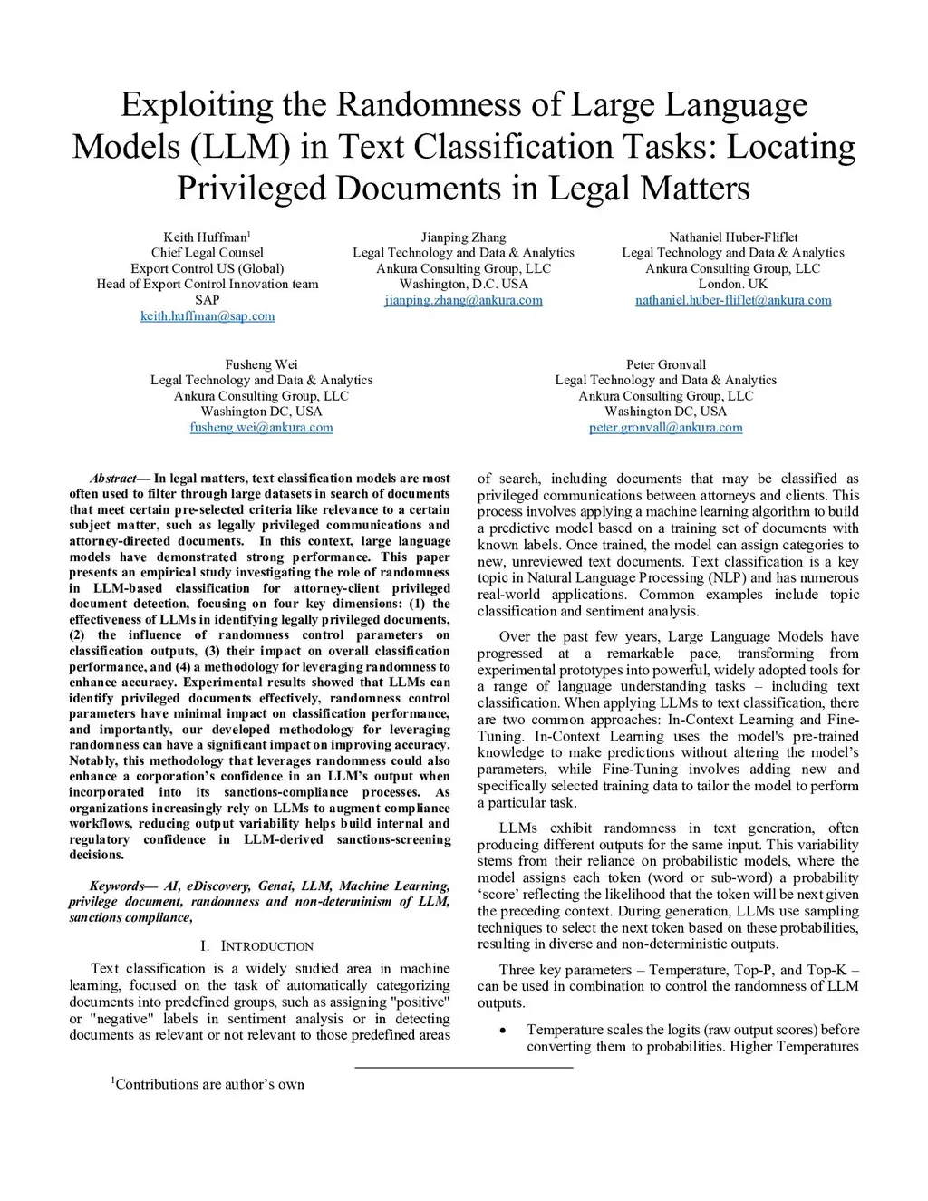 In legal matters, text classification models are most often used to filter through large datasets in search of documents that meet certain pre-selected criteria like relevance to a certain subject matter, such as legally privileged communications and attorney-directed documents. In this context, large language models have demonstrated strong performance. This paper presents an empirical study investigating the role of randomness in LLM-based classification for attorney-client privileged document detection, focusing on four key dimensions: (1) the effectiveness of LLMs in identifying legally privileged documents, (2) the influence of randomness control parameters on classification outputs, (3) their impact on overall classification performance, and (4) a methodology for leveraging randomness to enhance accuracy. Experimental results showed that LLMs can identify privileged documents effectively, randomness control parameters have minimal impact on classification performance, and importantly, our developed methodology for leveraging randomness can have a significant impact on improving accuracy. Notably, this methodology that leverages randomness could also enhance a corporation's confidence in an LLM's output when incorporated into its sanctions-compliance processes. As organizations increasingly rely on LLMs to augment compliance workflows, reducing output variability helps build internal and regulatory confidence in LLM-derived sanctions-screening decisions.
