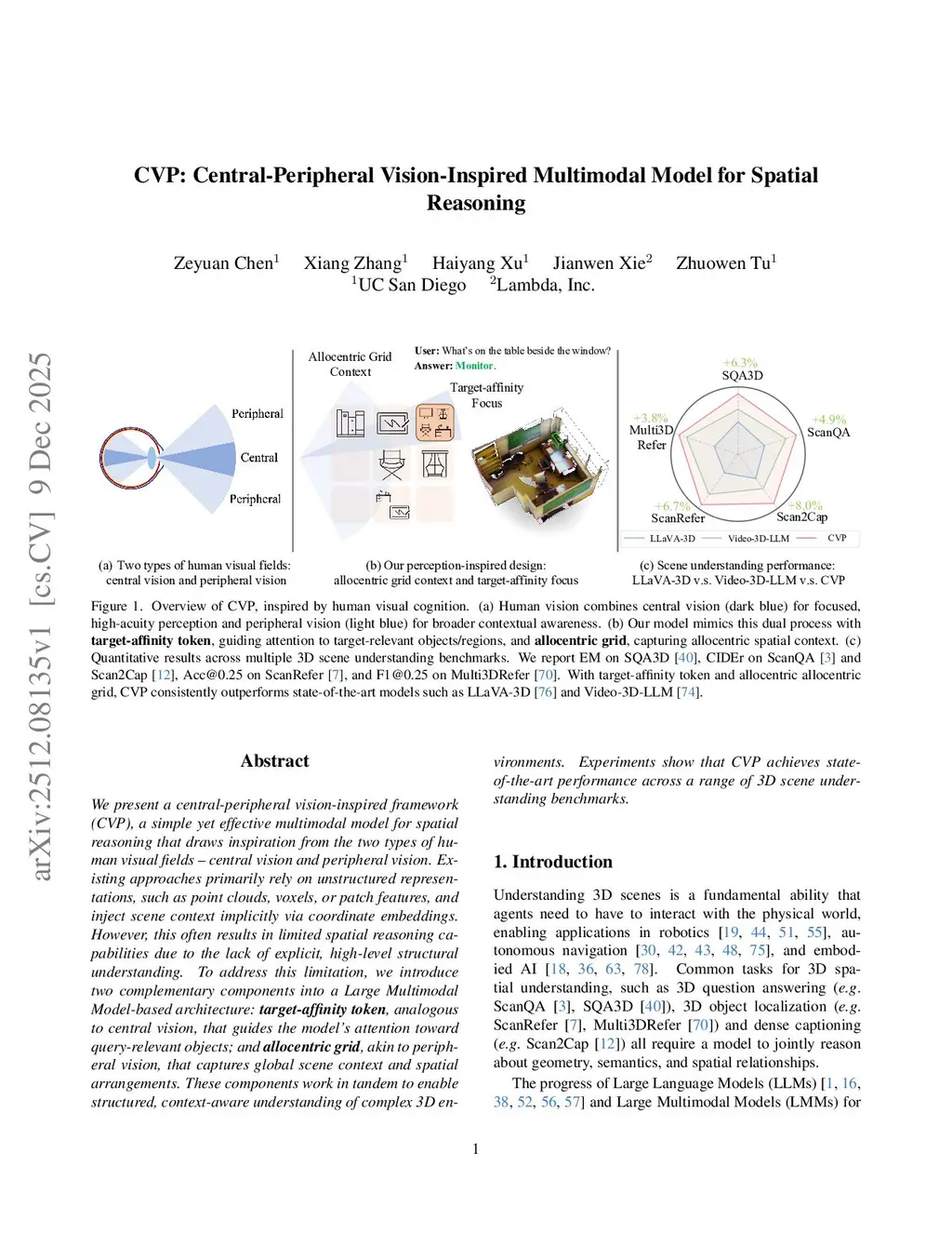 We present a central-peripheral vision-inspired framework (CVP), a simple yet effective multimodal model for spatial reasoning that draws inspiration from the two types of human visual fields -- central vision and peripheral vision. Existing approaches primarily rely on unstructured representations, such as point clouds, voxels, or patch features, and inject scene context implicitly via coordinate embeddings. However, this often results in limited spatial reasoning capabilities due to the lack of explicit, high-level structural understanding. To address this limitation, we introduce two complementary components into a Large Multimodal Model-based architecture: target-affinity token, analogous to central vision, that guides the model's attention toward query-relevant objects; and allocentric grid, akin to peripheral vision, that captures global scene context and spatial arrangements. These components work in tandem to enable structured, context-aware understanding of complex 3D environments. Experiments show that CVP achieves state-of-the-art performance across a range of 3D scene understanding benchmarks.