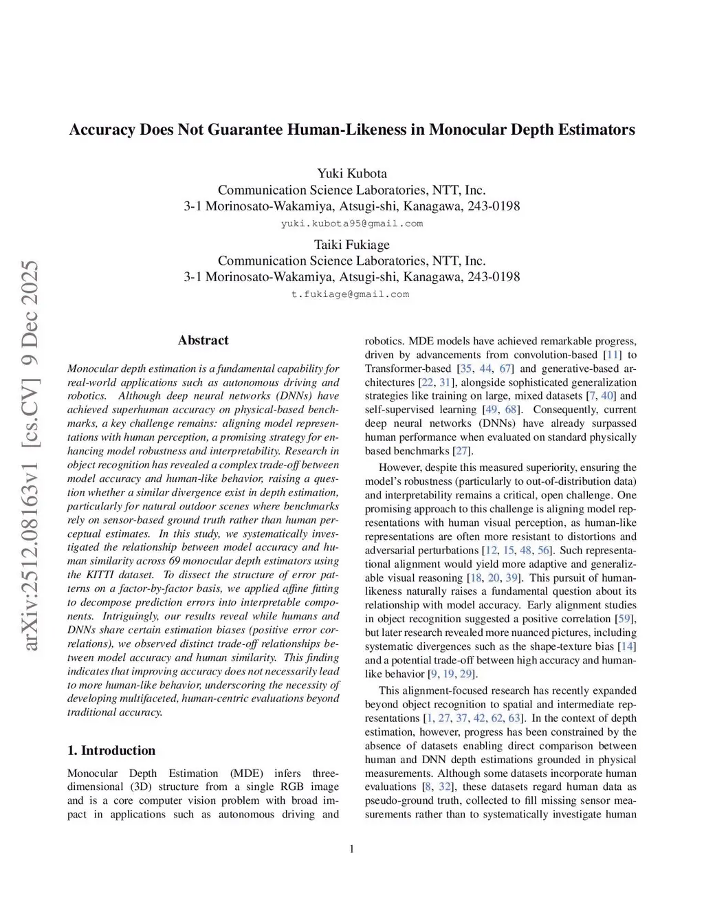 Monocular depth estimation is a fundamental capability for real-world applications such as autonomous driving and robotics. Although deep neural networks (DNNs) have achieved superhuman accuracy on physical-based benchmarks, a key challenge remains: aligning model representations with human perception, a promising strategy for enhancing model robustness and interpretability. Research in object recognition has revealed a complex trade-off between model accuracy and human-like behavior, raising a question whether a similar divergence exist in depth estimation, particularly for natural outdoor scenes where benchmarks rely on sensor-based ground truth rather than human perceptual estimates. In this study, we systematically investigated the relationship between model accuracy and human similarity across 69 monocular depth estimators using the KITTI dataset. To dissect the structure of error patterns on a factor-by-factor basis, we applied affine fitting to decompose prediction errors into interpretable components. Intriguingly, our results reveal while humans and DNNs share certain estimation biases (positive error correlations), we observed distinct trade-off relationships between model accuracy and human similarity. This finding indicates that improving accuracy does not necessarily lead to more human-like behavior, underscoring the necessity of developing multifaceted, human-centric evaluations beyond traditional accuracy.