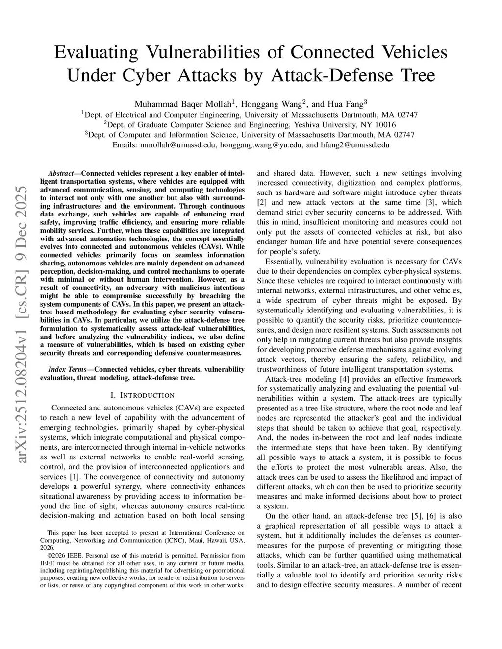 Evaluating Vulnerabilities of Connected Vehicles Under Cyber Attacks by Attack-Defense Tree