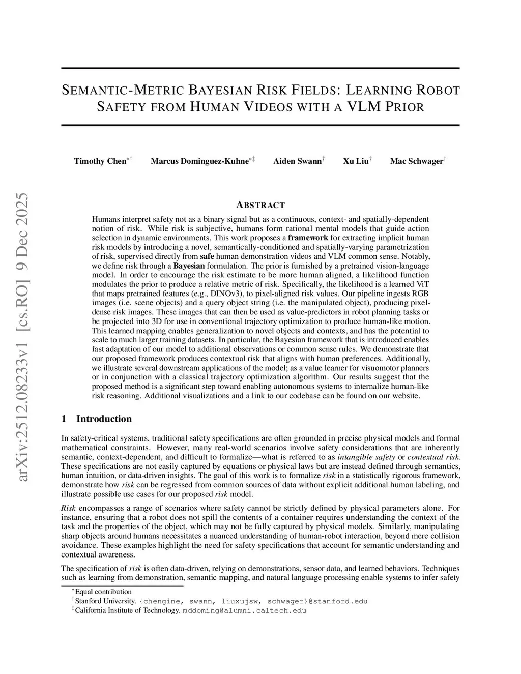 Humans interpret safety not as a binary signal but as a continuous, context- and spatially-dependent notion of risk. While risk is subjective, humans form rational mental models that guide action selection in dynamic environments. This work proposes a framework for extracting implicit human risk models by introducing a novel, semantically-conditioned and spatially-varying parametrization of risk, supervised directly from safe human demonstration videos and VLM common sense. Notably, we define risk through a Bayesian formulation. The prior is furnished by a pretrained vision-language model. In order to encourage the risk estimate to be more human aligned, a likelihood function modulates the prior to produce a relative metric of risk. Specifically, the likelihood is a learned ViT that maps pretrained features, to pixel-aligned risk values. Our pipeline ingests RGB images and a query object string, producing pixel-dense risk images. These images that can then be used as value-predictors in robot planning tasks or be projected into 3D for use in conventional trajectory optimization to produce human-like motion. This learned mapping enables generalization to novel objects and contexts, and has the potential to scale to much larger training datasets. In particular, the Bayesian framework that is introduced enables fast adaptation of our model to additional observations or common sense rules. We demonstrate that our proposed framework produces contextual risk that aligns with human preferences. Additionally, we illustrate several downstream applications of the model; as a value learner for visuomotor planners or in conjunction with a classical trajectory optimization algorithm. Our results suggest that our framework is a significant step toward enabling autonomous systems to internalize human-like risk. Code and results can be found atthis https URL.