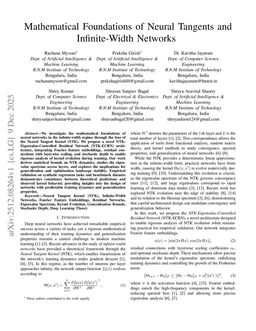 We investigate the mathematical foundations of neural networks in the infinite-width regime through the Neural Tangent Kernel (NTK). We propose the NTK-Eigenvalue-Controlled Residual Network (NTK-ECRN), an architecture integrating Fourier feature embeddings, residual connections with layerwise scaling, and stochastic depth to enable rigorous analysis of kernel evolution during training. Our theoretical contributions include deriving bounds on NTK dynamics, characterizing eigenvalue evolution, and linking spectral properties to generalization and optimization stability. Empirical results on synthetic and benchmark datasets validate the predicted kernel behavior and demonstrate improved training stability and generalization. This work provides a comprehensive framework bridging infinite-width theory and practical deep-learning architectures.