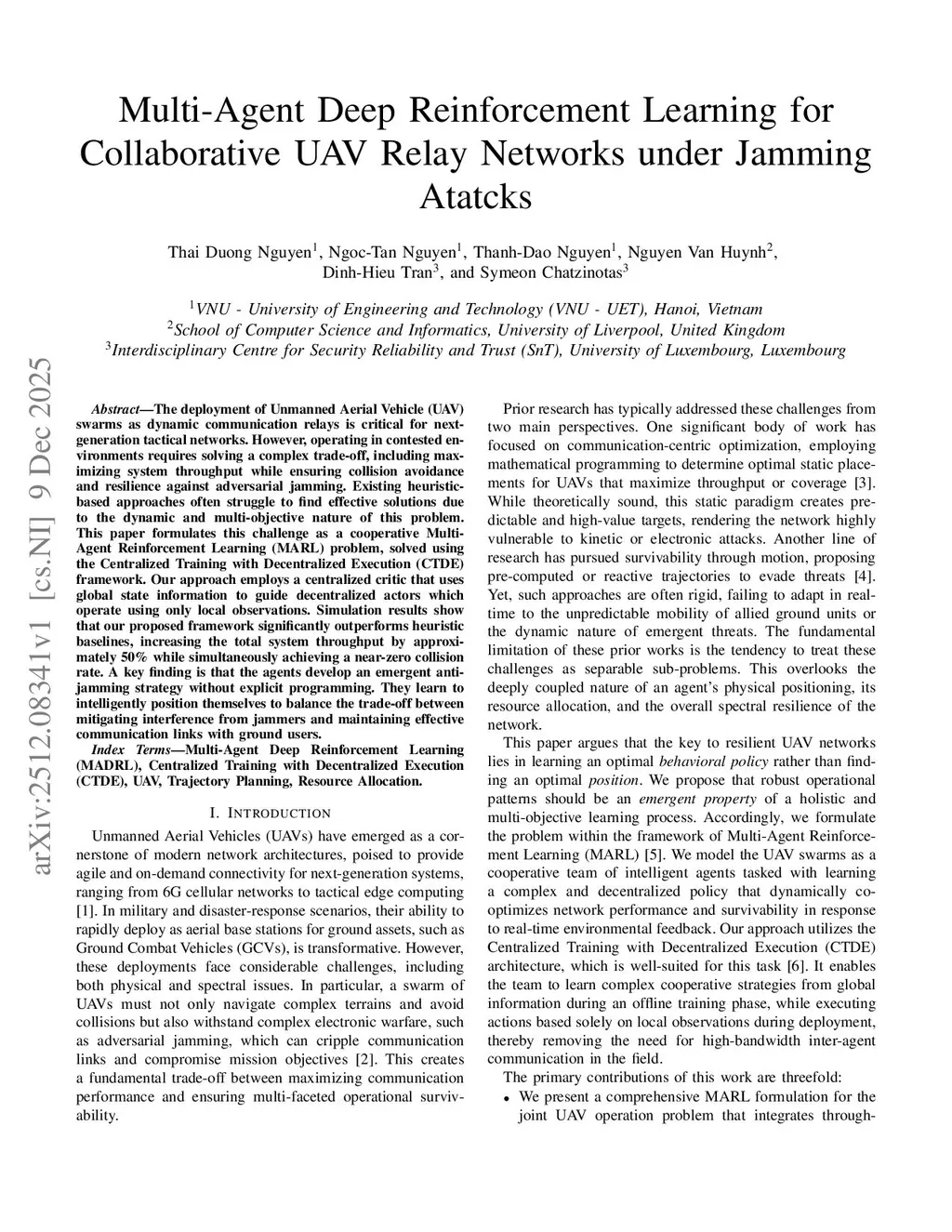 The deployment of Unmanned Aerial Vehicle (UAV) swarms as dynamic communication relays is critical for next-generation tactical networks. However, operating in contested environments requires solving a complex trade-off, including maximizing system throughput while ensuring collision avoidance and resilience against adversarial jamming. Existing heuristic-based approaches often struggle to find effective solutions due to the dynamic and multi-objective nature of this problem. This paper formulates this challenge as a cooperative Multi-Agent Reinforcement Learning (MARL) problem, solved using the Centralized Training with Decentralized Execution (CTDE) framework. Our approach employs a centralized critic that uses global state information to guide decentralized actors which operate using only local observations. Simulation results show that our proposed framework significantly outperforms heuristic baselines, increasing the total system throughput by approximately 50% while simultaneously achieving a near-zero collision rate. A key finding is that the agents develop an emergent anti-jamming strategy without explicit programming. They learn to intelligently position themselves to balance the trade-off between mitigating interference from jammers and maintaining effective communication links with ground users.