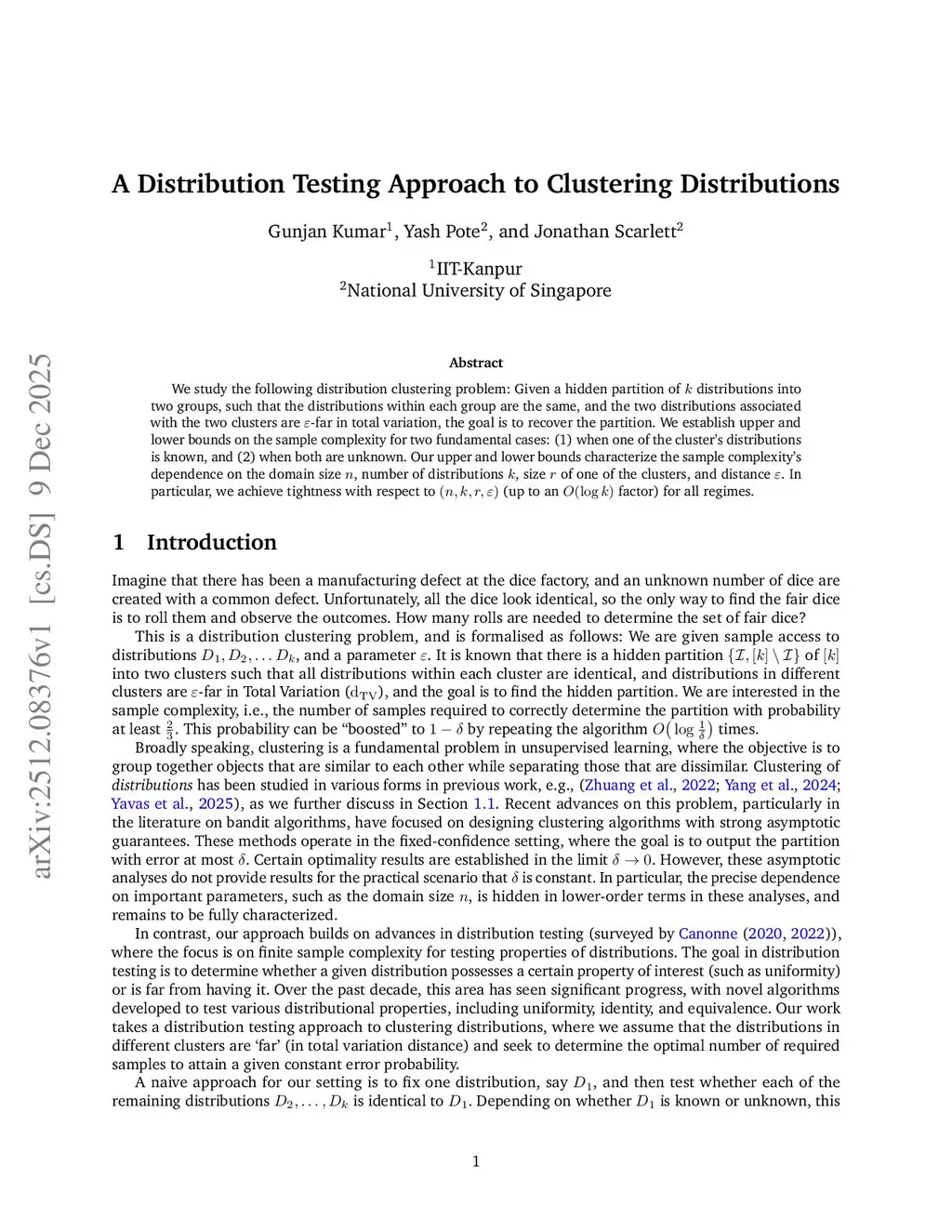 We study the following distribution clustering problem: Given a hidden partition of distributions into two groups, such that the distributions within each group are the same, and the two distributions associated with the two clusters are -far in total variation, the goal is to recover the partition. We establish upper and lower bounds on the sample complexity for two fundamental cases: (1) when one of the cluster's distributions is known, and (2) when both are unknown. Our upper and lower bounds characterize the sample complexity's dependence on the domain size , number of distributions , size of one of the clusters, and distance . In particular, we achieve tightness with respect to (up to an factor) for all regimes.