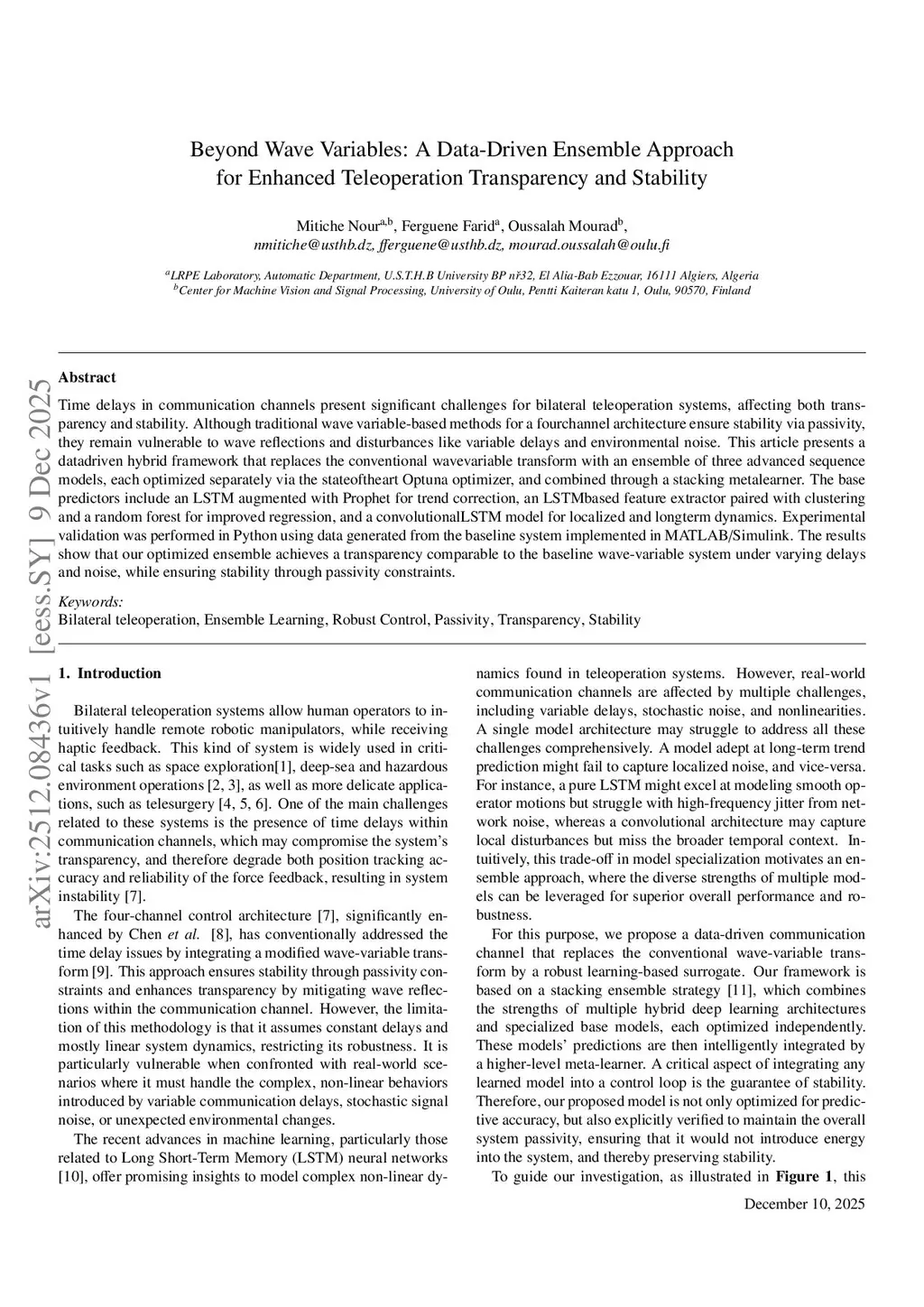 Time delays in communication channels present significant challenges for bilateral teleoperation systems, affecting both transparency and stability. Although traditional wave variable-based methods for a four-channel architecture ensure stability via passivity, they remain vulnerable to wave reflections and disturbances like variable delays and environmental noise. This article presents a data-driven hybrid framework that replaces the conventional wave-variable transform with an ensemble of three advanced sequence models, each optimized separately via the state-of-the-art Optuna optimizer, and combined through a stacking meta-learner. The base predictors include an LSTM augmented with Prophet for trend correction, an LSTM-based feature extractor paired with clustering and a random forest for improved regression, and a CNN-LSTM model for localized and long-term dynamics. Experimental validation was performed in Python using data generated from the baseline system implemented in MATLAB/Simulink. The results show that our optimized ensemble achieves a transparency comparable to the baseline wave-variable system under varying delays and noise, while ensuring stability through passivity constraints.