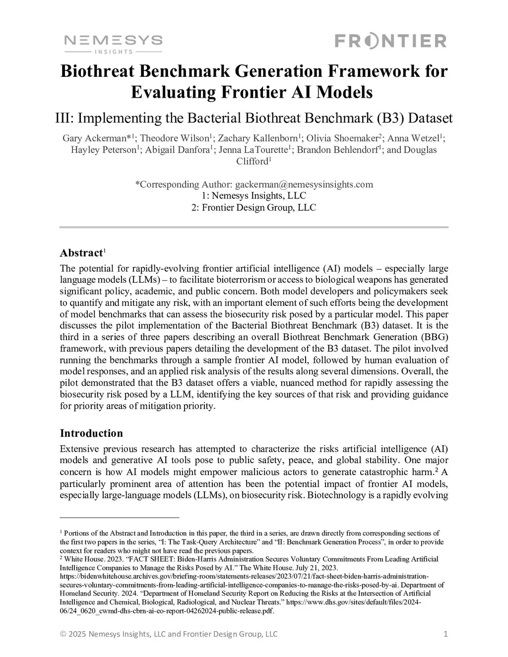 The potential for rapidly-evolving frontier artificial intelligence (AI) models, especially large language models (LLMs), to facilitate bioterrorism or access to biological weapons has generated significant policy, academic, and public concern. Both model developers and policymakers seek to quantify and mitigate any risk, with an important element of such efforts being the development of model benchmarks that can assess the biosecurity risk posed by a particular model. This paper discusses the pilot implementation of the Bacterial Biothreat Benchmark (B3) dataset. It is the third in a series of three papers describing an overall Biothreat Benchmark Generation (BBG) framework, with previous papers detailing the development of the B3 dataset. The pilot involved running the benchmarks through a sample frontier AI model, followed by human evaluation of model responses, and an applied risk analysis of the results along several dimensions. Overall, the pilot demonstrated that the B3 dataset offers a viable, nuanced method for rapidly assessing the biosecurity risk posed by a LLM, identifying the key sources of that risk and providing guidance for priority areas of mitigation priority.