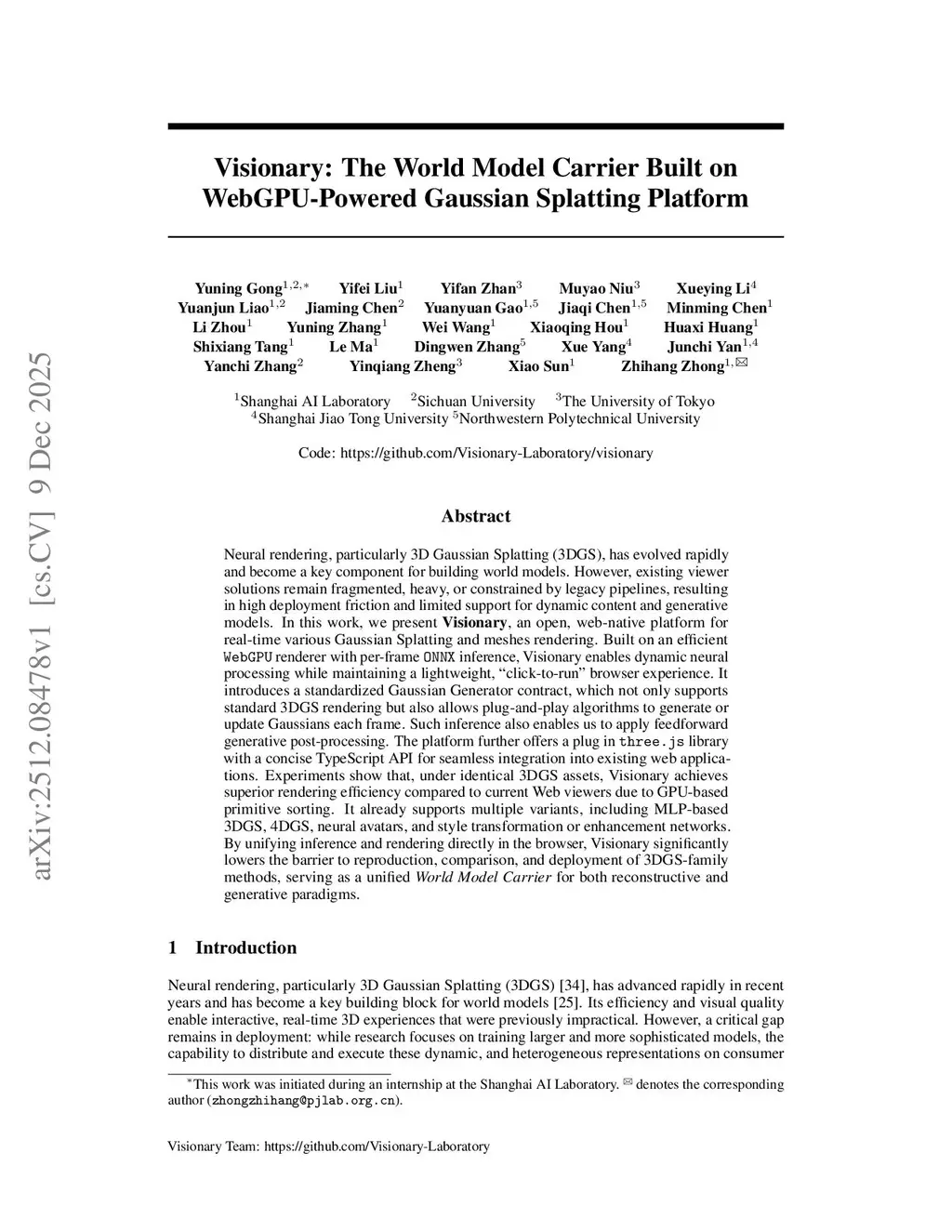 Visionary: The World Model Carrier Built on WebGPU-Powered Gaussian Splatting Platform