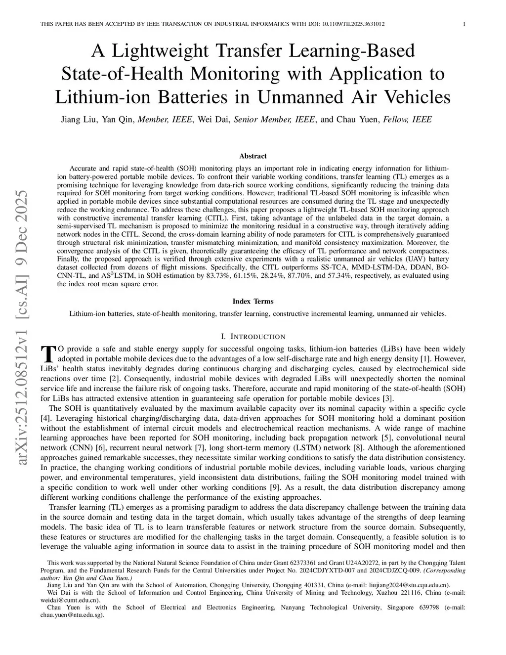 A Lightweight Transfer Learning-Based State-of-Health Monitoring with Application to Lithium-ion Batteries in Autonomous Air Vehicles