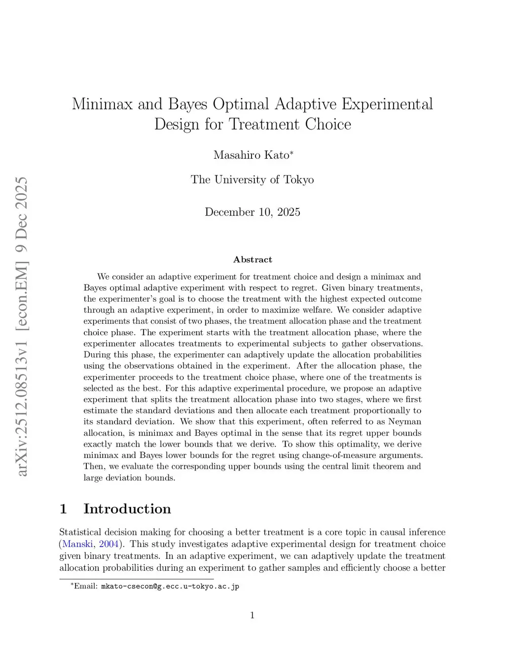We consider an adaptive experiment for treatment choice and design a minimax and Bayes optimal adaptive experiment with respect to regret. Given binary treatments, the experimenter's goal is to choose the treatment with the highest expected outcome through an adaptive experiment, in order to maximize welfare. We consider adaptive experiments that consist of two phases, the treatment allocation phase and the treatment choice phase. The experiment starts with the treatment allocation phase, where the experimenter allocates treatments to experimental subjects to gather observations. During this phase, the experimenter can adaptively update the allocation probabilities using the observations obtained in the experiment. After the allocation phase, the experimenter proceeds to the treatment choice phase, where one of the treatments is selected as the best. For this adaptive experimental procedure, we propose an adaptive experiment that splits the treatment allocation phase into two stages, where we first estimate the standard deviations and then allocate each treatment proportionally to its standard deviation. We show that this experiment, often referred to as Neyman allocation, is minimax and Bayes optimal in the sense that its regret upper bounds exactly match the lower bounds that we derive. To show this optimality, we derive minimax and Bayes lower bounds for the regret using change-of-measure arguments. Then, we evaluate the corresponding upper bounds using the central limit theorem and large deviation bounds.