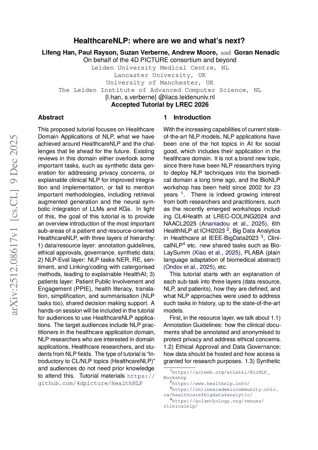 This proposed tutorial focuses on Healthcare Domain Applications of NLP, what we have achieved around HealthcareNLP, and the challenges that lie ahead for the future. Existing reviews in this domain either overlook some important tasks, such as synthetic data generation for addressing privacy concerns, or explainable clinical NLP for improved integration and implementation, or fail to mention important methodologies, including retrieval augmented generation and the neural symbolic integration of LLMs and KGs. In light of this, the goal of this tutorial is to provide an introductory overview of the most important sub-areas of a patient- and resource-oriented HealthcareNLP, with three layers of hierarchy: data/resource layer: annotation guidelines, ethical approvals, governance, synthetic data; NLP-Eval layer: NLP tasks such as NER, RE, sentiment analysis, and linking/coding with categorised methods, leading to explainable HealthAI; patients layer: Patient Public Involvement and Engagement (PPIE), health literacy, translation, simplification, and summarisation (also NLP tasks), and shared decision-making support. A hands-on session will be included in the tutorial for the audience to use HealthcareNLP applications. The target audience includes NLP practitioners in the healthcare application domain, NLP researchers who are interested in domain applications, healthcare researchers, and students from NLP fields. The type of tutorial is "Introductory to CL/NLP topics (HealthcareNLP)" and the audience does not need prior knowledge to attend this. Tutorial materials:this https URL