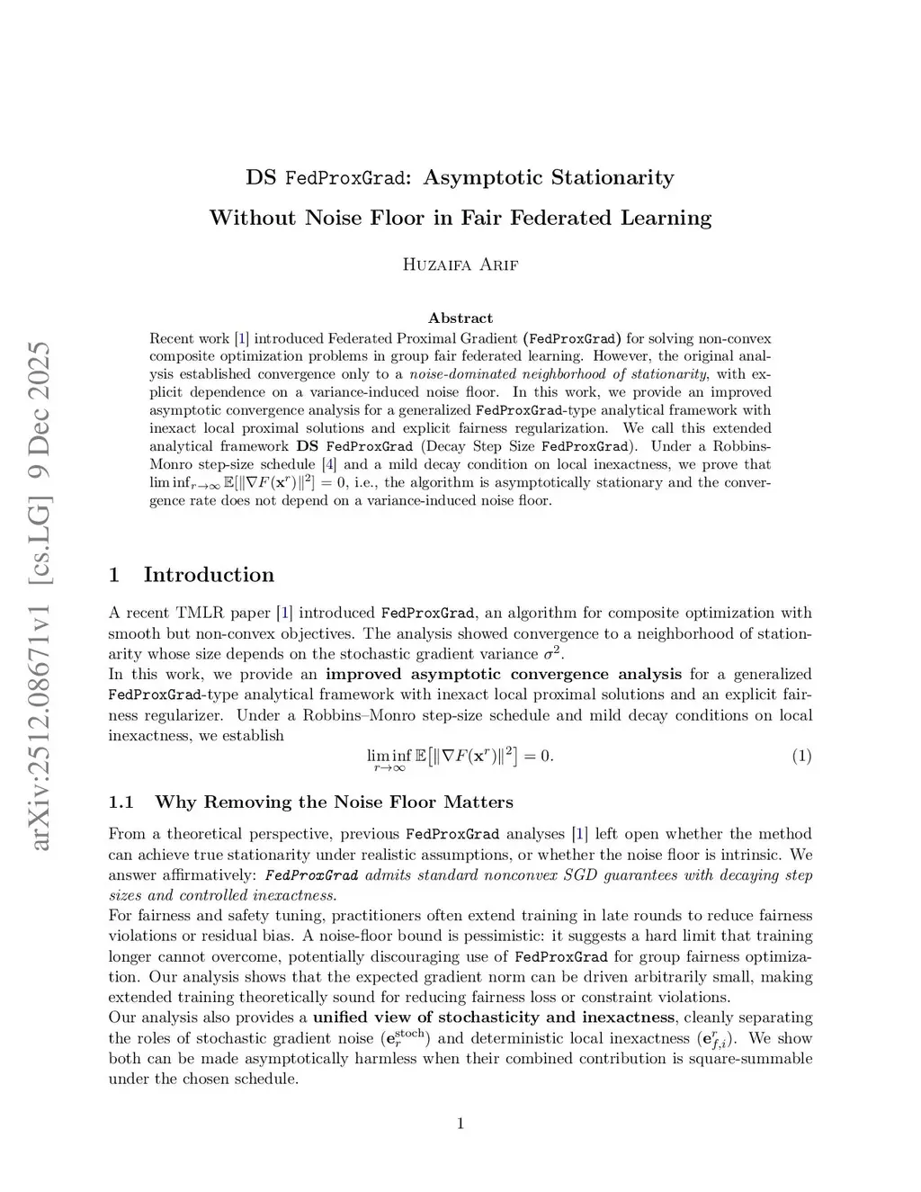 Recent work \cite{arifgroup} introduced Federated Proximal Gradient \textbf{(\texttt{FedProxGrad})} for solving non-convex composite optimization problems in group fair federated learning. However, the original analysis established convergence only to a \textit{noise-dominated neighborhood of stationarity}, with explicit dependence on a variance-induced noise floor. In this work, we provide an improved asymptotic convergence analysis for a generalized \texttt{FedProxGrad}-type analytical framework with inexact local proximal solutions and explicit fairness regularization. We call this extended analytical framework \textbf{DS \texttt{FedProxGrad}} (Decay Step Size \texttt{FedProxGrad}). Under a Robbins-Monro step-size schedule \cite{robbins1951stochastic} and a mild decay condition on local inexactness, we prove that , i.e., the algorithm is asymptotically stationary and the convergence rate does not depend on a variance-induced noise floor.