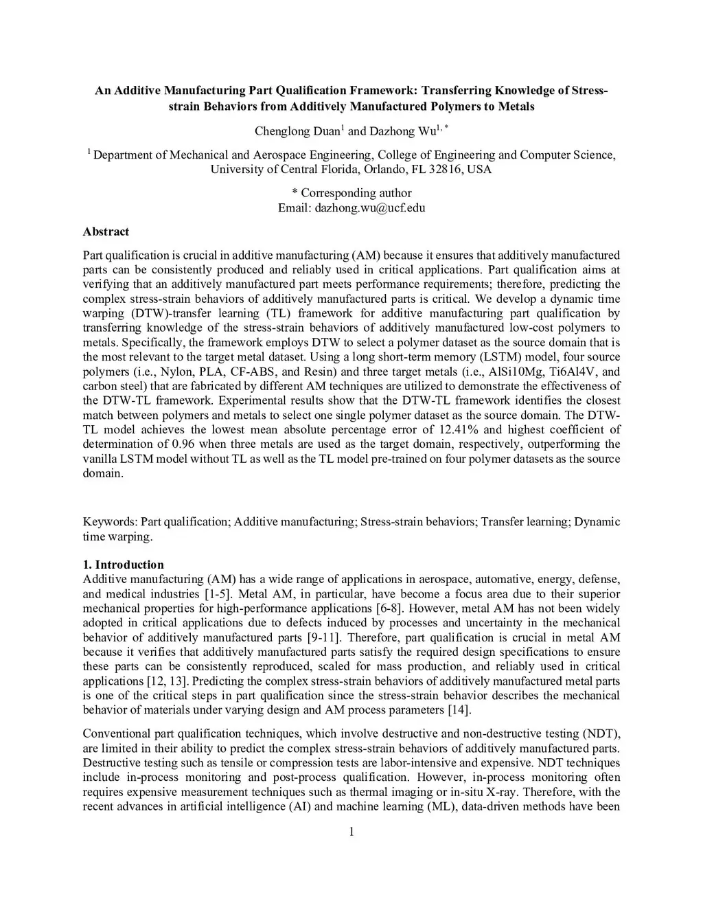 Part qualification in additive manufacturing (AM) ensures that additively manufactured parts can be consistently produced and reliably used in critical applications. One crucial aspect of part qualification is to determine the complex stress-strain behavior of additively manufactured parts. However, conventional part qualification techniques such as the destructive testing and non-destructive testing are costly and time consuming, especially for metal AM. To address this challenge, we develop a dynamic time warping (DTW)-transfer learning (TL) framework for AM part qualification by transferring knowledge gained from the stress-strain behaviors of additively manufactured low-cost polymers to high-performance, expensive metals. Specifically, the framework selects one single optimal polymer dataset that is the most similar to the metal dataset in the target domain using DTW among multiple polymer datasets, including Nylon, PLA, CF-ABS, and Resin. A long short-term memory (LSTM) model is then trained on one single optimal polymer dataset and tested on one of three target metal datasets, including AlSi10Mg, Ti6Al4V, and carbon steel datasets. Experimental results show that the Resin dataset is selected as the optimal polymer dataset in the source domain for the AlSi10Mg and Ti6Al4V datasets, while the Nylon dataset is selected as the optimal polymer dataset in the source domain for the carbon steel dataset. The DTWTL model trained on one single optimal polymer dataset as the source domain achieves the best predictive performance, including an average mean absolute percentage error of 12.41%, an average root mean squared error of 63.75, and an average coefficient of determination of 0.96 when three metals are used as the target domain, outperforming the vanilla LSTM model without TL as well as the TL model trained on all four polymer datasets as the source domain.