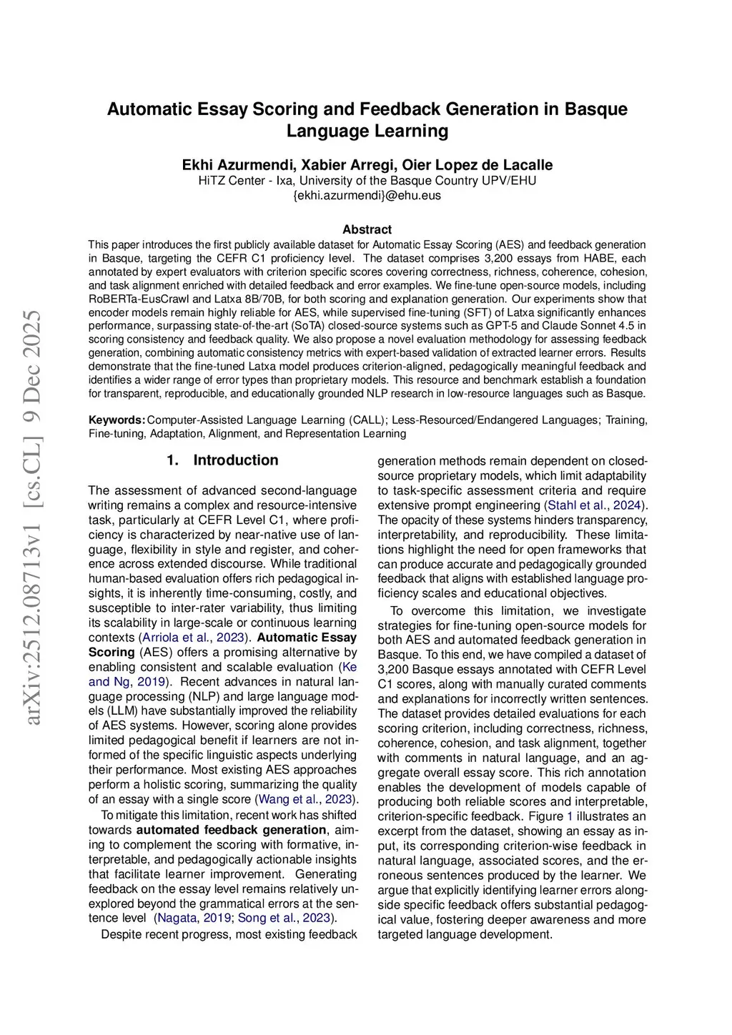 This paper introduces the first publicly available dataset for Automatic Essay Scoring (AES) and feedback generation in Basque, targeting the CEFR C1 proficiency level. The dataset comprises 3,200 essays from HABE, each annotated by expert evaluators with criterion specific scores covering correctness, richness, coherence, cohesion, and task alignment enriched with detailed feedback and error examples. We fine-tune open-source models, including RoBERTa-EusCrawl and Latxa 8B/70B, for both scoring and explanation generation. Our experiments show that encoder models remain highly reliable for AES, while supervised fine-tuning (SFT) of Latxa significantly enhances performance, surpassing state-of-the-art (SoTA) closed-source systems such as GPT-5 and Claude Sonnet 4.5 in scoring consistency and feedback quality. We also propose a novel evaluation methodology for assessing feedback generation, combining automatic consistency metrics with expert-based validation of extracted learner errors. Results demonstrate that the fine-tuned Latxa model produces criterion-aligned, pedagogically meaningful feedback and identifies a wider range of error types than proprietary models. This resource and benchmark establish a foundation for transparent, reproducible, and educationally grounded NLP research in low-resource languages such as Basque.