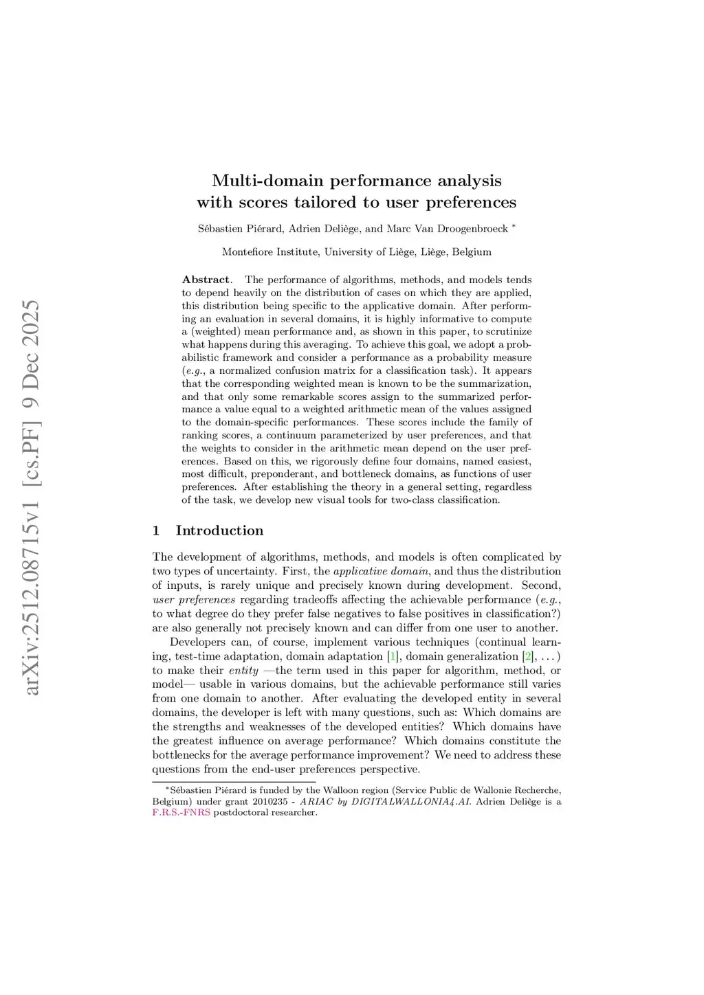 The performance of algorithms, methods, and models tends to depend heavily on the distribution of cases on which they are applied, this distribution being specific to the applicative domain. After performing an evaluation in several domains, it is highly informative to compute a (weighted) mean performance and, as shown in this paper, to scrutinize what happens during this averaging. To achieve this goal, we adopt a probabilistic framework and consider a performance as a probability measure (e.g., a normalized confusion matrix for a classification task). It appears that the corresponding weighted mean is known to be the summarization, and that only some remarkable scores assign to the summarized performance a value equal to a weighted arithmetic mean of the values assigned to the domain-specific performances. These scores include the family of ranking scores, a continuum parameterized by user preferences, and that the weights to consider in the arithmetic mean depend on the user preferences. Based on this, we rigorously define four domains, named easiest, most difficult, preponderant, and bottleneck domains, as functions of user preferences. After establishing the theory in a general setting, regardless of the task, we develop new visual tools for two-class classification.