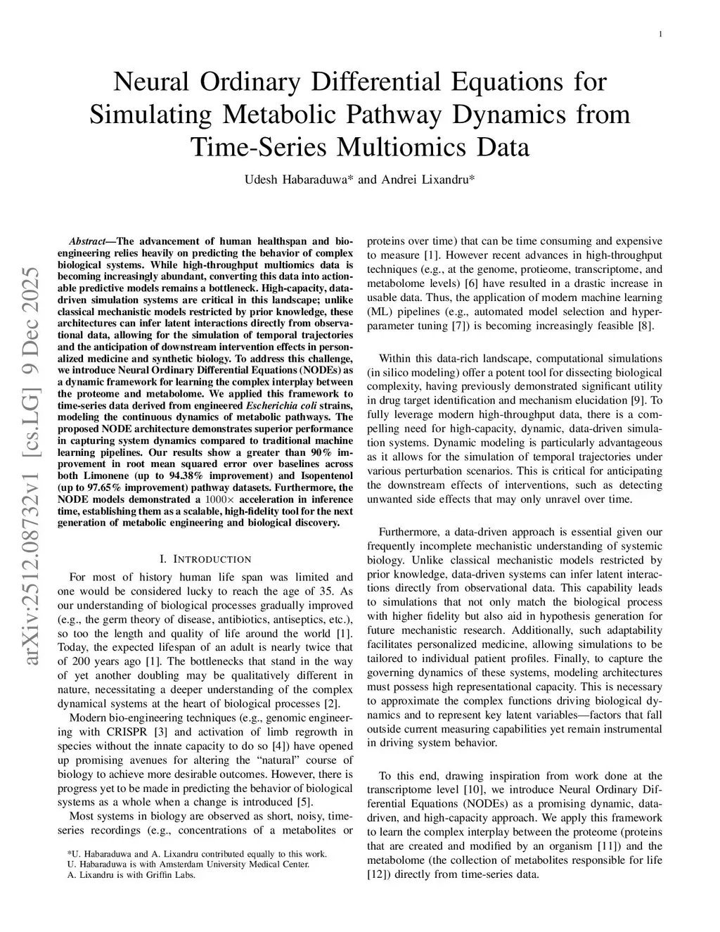The advancement of human healthspan and bioengineering relies heavily on predicting the behavior of complex biological systems. While high-throughput multiomics data is becoming increasingly abundant, converting this data into actionable predictive models remains a bottleneck. High-capacity, datadriven simulation systems are critical in this landscape; unlike classical mechanistic models restricted by prior knowledge, these architectures can infer latent interactions directly from observational data, allowing for the simulation of temporal trajectories and the anticipation of downstream intervention effects in personalized medicine and synthetic biology. To address this challenge, we introduce Neural Ordinary Differential Equations (NODEs) as a dynamic framework for learning the complex interplay between the proteome and metabolome. We applied this framework to time-series data derived from engineered Escherichia coli strains, modeling the continuous dynamics of metabolic pathways. The proposed NODE architecture demonstrates superior performance in capturing system dynamics compared to traditional machine learning pipelines. Our results show a greater than 90% improvement in root mean squared error over baselines across both Limonene (up to 94.38% improvement) and Isopentenol (up to 97.65% improvement) pathway datasets. Furthermore, the NODE models demonstrated a 1000x acceleration in inference time, establishing them as a scalable, high-fidelity tool for the next generation of metabolic engineering and biological discovery.
