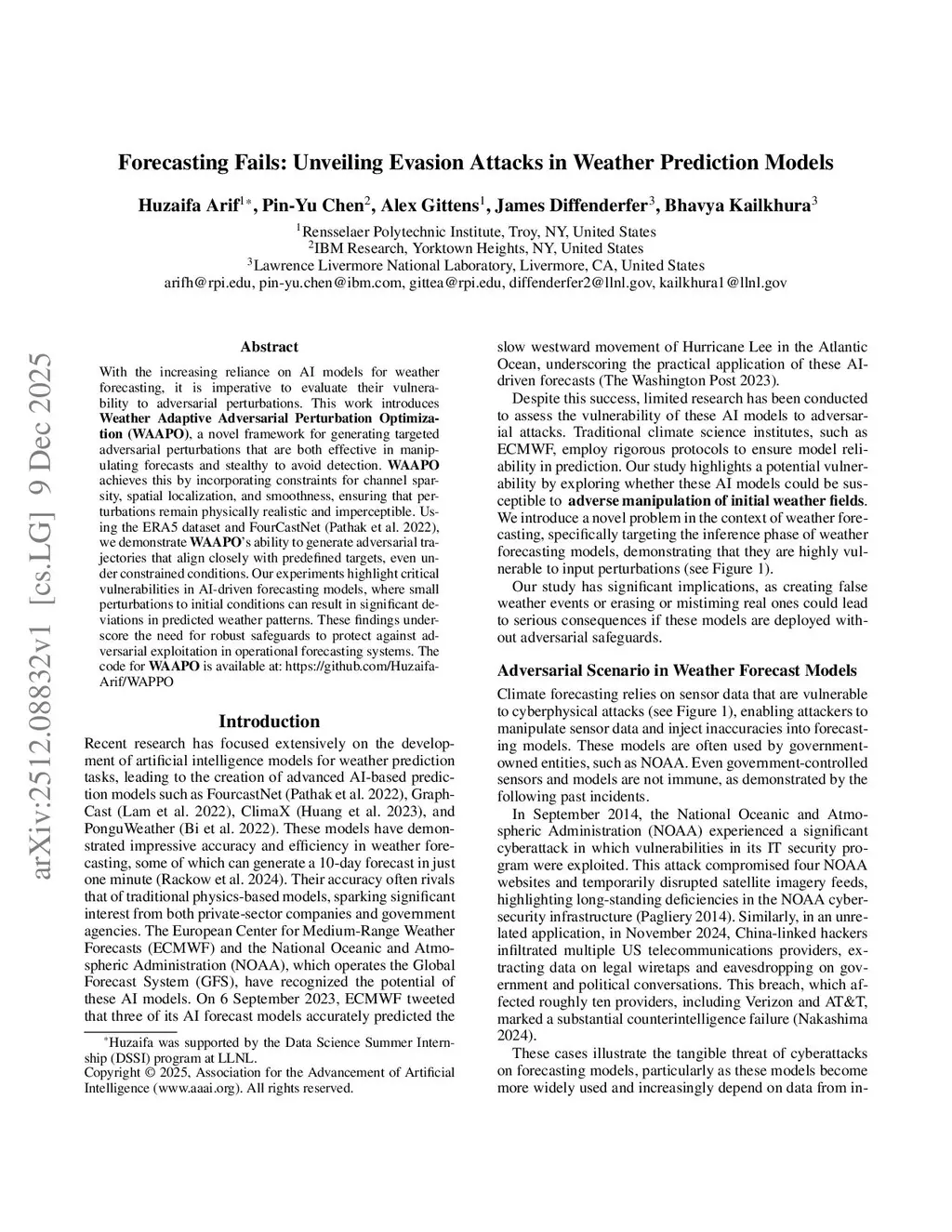 With the increasing reliance on AI models for weather forecasting, it is imperative to evaluate their vulnerability to adversarial perturbations. This work introduces Weather Adaptive Adversarial Perturbation Optimization (WAAPO), a novel framework for generating targeted adversarial perturbations that are both effective in manipulating forecasts and stealthy to avoid detection. WAAPO achieves this by incorporating constraints for channel sparsity, spatial localization, and smoothness, ensuring that perturbations remain physically realistic and imperceptible. Using the ERA5 dataset and FourCastNet (Pathak et al. 2022), we demonstrate WAAPO's ability to generate adversarial trajectories that align closely with predefined targets, even under constrained conditions. Our experiments highlight critical vulnerabilities in AI-driven forecasting models, where small perturbations to initial conditions can result in significant deviations in predicted weather patterns. These findings underscore the need for robust safeguards to protect against adversarial exploitation in operational forecasting systems.