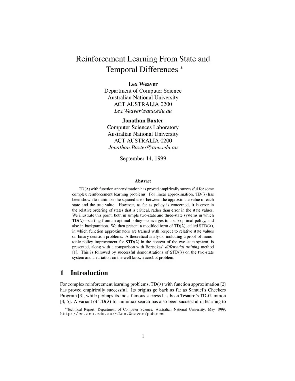 TD() with function approximation has proved empirically successful for some complex reinforcement learning problems. For linear approximation, TD() has been shown to minimise the squared error between the approximate value of each state and the true value. However, as far as policy is concerned, it is error in the relative ordering of states that is critical, rather than error in the state values. We illustrate this point, both in simple two-state and three-state systems in which TD()--starting from an optimal policy--converges to a sub-optimal policy, and also in backgammon. We then present a modified form of TD(), called STD(), in which function approximators are trained with respect to relative state values on binary decision problems. A theoretical analysis, including a proof of monotonic policy improvement for STD() in the context of the two-state system, is presented, along with a comparison with Bertsekas' differential training method [1]. This is followed by successful demonstrations of STD() on the two-state system and a variation on the well known acrobot problem.