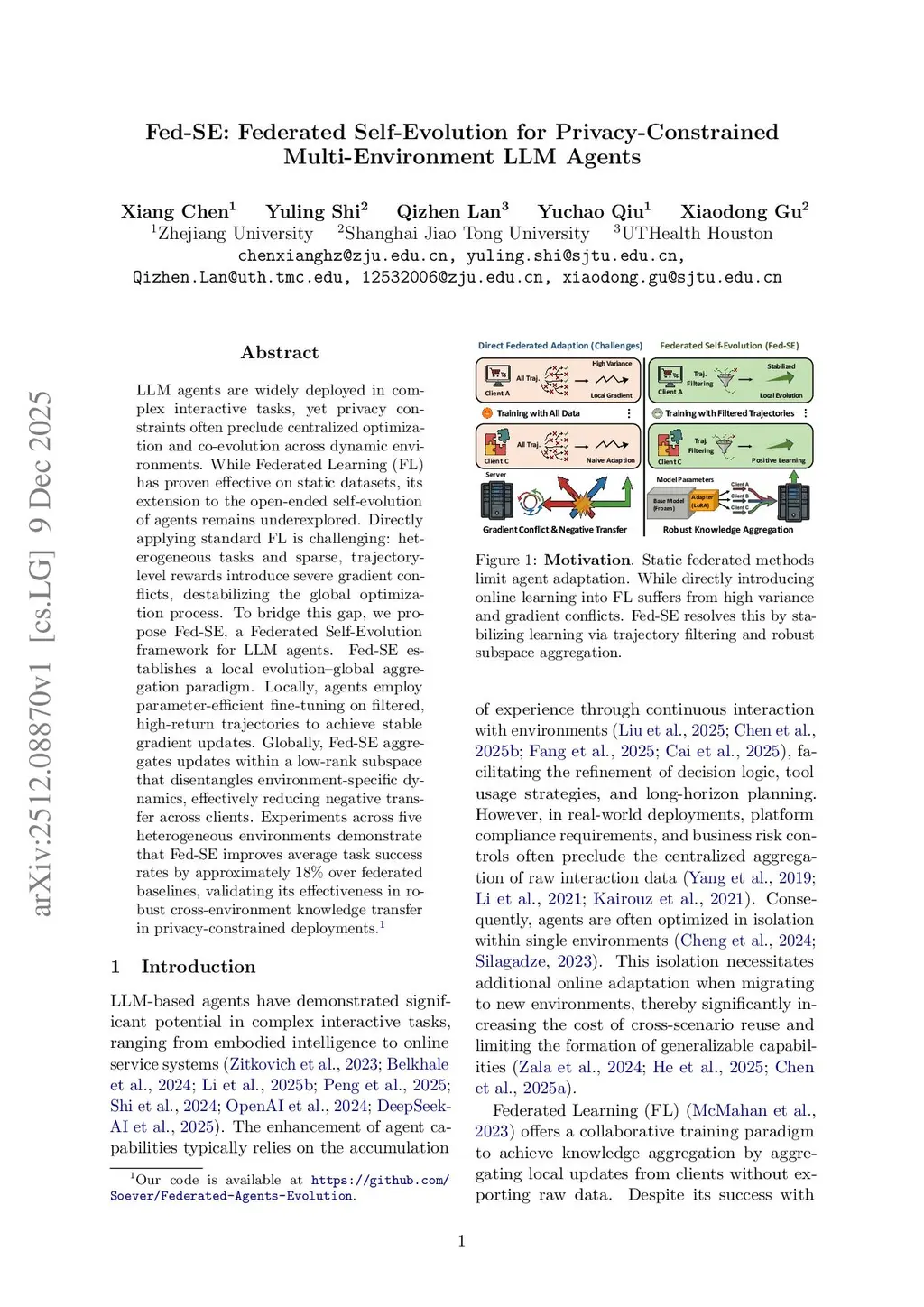 LLM agents are widely deployed in complex interactive tasks, yet privacy constraints often preclude centralized optimization and co-evolution across dynamic environments. Despite the demonstrated success of Federated Learning (FL) on static datasets, its effectiveness in open-ended, self-evolving agent systems remains largely unexplored. In such settings, the direct application of standard FL is particularly challenging, as heterogeneous tasks and sparse, trajectory-level reward signals give rise to severe gradient instability, which undermines the global optimization process. To bridge this gap, we propose Fed-SE, a Federated Self-Evolution framework for LLM agents that establishes a local evolution-global aggregation paradigm. Locally, agents employ parameter-efficient fine-tuning on filtered, high-return trajectories to achieve stable gradient updates. Globally, Fed-SE aggregates updates within a low-rank subspace, reducing communication cost across clients. Experiments across five heterogeneous environments demonstrate that Fed-SE improves average task success rates by 10\% over the state-of-the-art FedIT, validating its effectiveness in cross-environment knowledge transfer under privacy constraints.