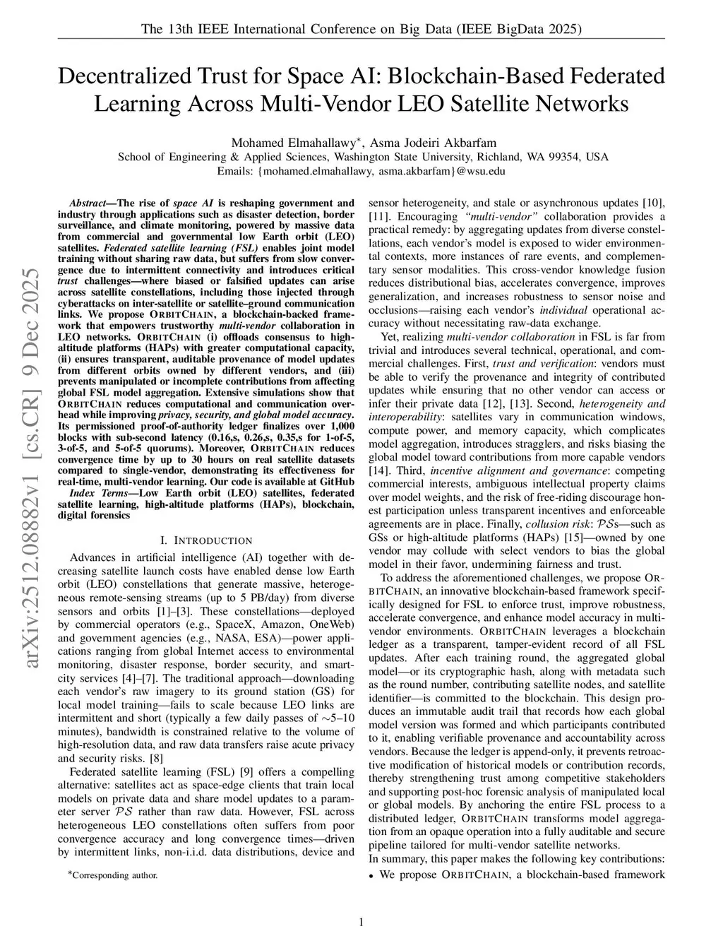 The rise of space AI is reshaping government and industry through applications such as disaster detection, border surveillance, and climate monitoring, powered by massive data from commercial and governmental low Earth orbit (LEO) satellites. Federated satellite learning (FSL) enables joint model training without sharing raw data, but suffers from slow convergence due to intermittent connectivity and introduces critical trust challenges--where biased or falsified updates can arise across satellite constellations, including those injected through cyberattacks on inter-satellite or satellite-ground communication links. We propose OrbitChain, a blockchain-backed framework that empowers trustworthy multi-vendor collaboration in LEO networks. OrbitChain (i) offloads consensus to high-altitude platforms (HAPs) with greater computational capacity, (ii) ensures transparent, auditable provenance of model updates from different orbits owned by different vendors, and (iii) prevents manipulated or incomplete contributions from affecting global FSL model aggregation. Extensive simulations show that OrbitChain reduces computational and communication overhead while improving privacy, security, and global model accuracy. Its permissioned proof-of-authority ledger finalizes over 1000 blocks with sub-second latency (0.16,s, 0.26,s, 0.35,s for 1-of-5, 3-of-5, and 5-of-5 quorums). Moreover, OrbitChain reduces convergence time by up to 30 hours on real satellite datasets compared to single-vendor, demonstrating its effectiveness for real-time, multi-vendor learning. Our code is available atthis https URL