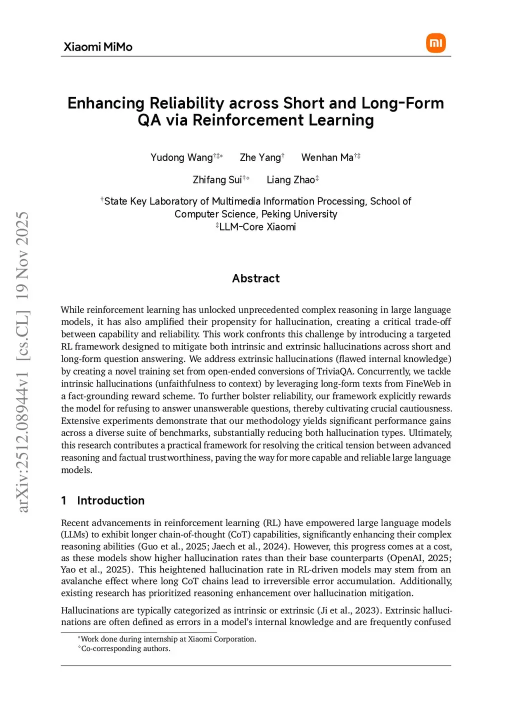 While reinforcement learning has unlocked unprecedented complex reasoning in large language models, it has also amplified their propensity for hallucination, creating a critical trade-off between capability and reliability. This work confronts this challenge by introducing a targeted RL framework designed to mitigate both intrinsic and extrinsic hallucinations across short and long-form question answering. We address extrinsic hallucinations (flawed internal knowledge) by creating a novel training set from open-ended conversions of TriviaQA. Concurrently, we tackle intrinsic hallucinations (unfaithfulness to context) by leveraging long-form texts from FineWeb in a fact-grounding reward scheme. To further bolster reliability, our framework explicitly rewards the model for refusing to answer unanswerable questions, thereby cultivating crucial cautiousness. Extensive experiments demonstrate that our methodology yields significant performance gains across a diverse suite of benchmarks, substantially reducing both hallucination types. Ultimately, this research contributes a practical framework for resolving the critical tension between advanced reasoning and factual trustworthiness, paving the way for more capable and reliable large language models.