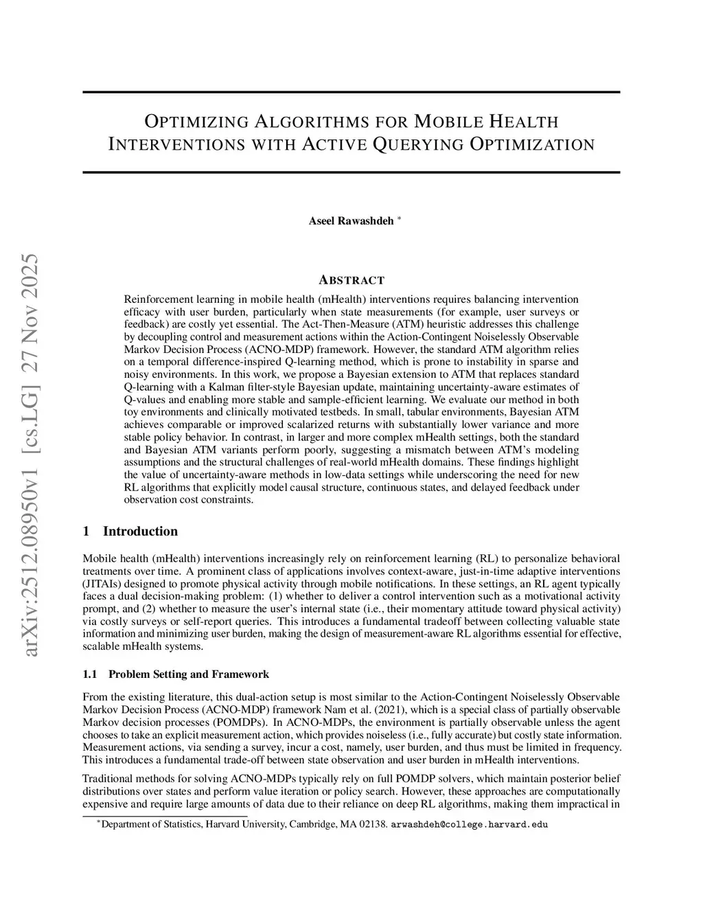 Reinforcement learning in mobile health (mHealth) interventions requires balancing intervention efficacy with user burden, particularly when state measurements (for example, user surveys or feedback) are costly yet essential. The Act-Then-Measure (ATM) heuristic addresses this challenge by decoupling control and measurement actions within the Action-Contingent Noiselessly Observable Markov Decision Process (ACNO-MDP) framework. However, the standard ATM algorithm relies on a temporal-difference-inspired Q-learning method, which is prone to instability in sparse and noisy environments. In this work, we propose a Bayesian extension to ATM that replaces standard Q-learning with a Kalman filter-style Bayesian update, maintaining uncertainty-aware estimates of Q-values and enabling more stable and sample-efficient learning. We evaluate our method in both toy environments and clinically motivated testbeds. In small, tabular environments, Bayesian ATM achieves comparable or improved scalarized returns with substantially lower variance and more stable policy behavior. In contrast, in larger and more complex mHealth settings, both the standard and Bayesian ATM variants perform poorly, suggesting a mismatch between ATM's modeling assumptions and the structural challenges of real-world mHealth domains. These findings highlight the value of uncertainty-aware methods in low-data settings while underscoring the need for new RL algorithms that explicitly model causal structure, continuous states, and delayed feedback under observation cost constraints.
