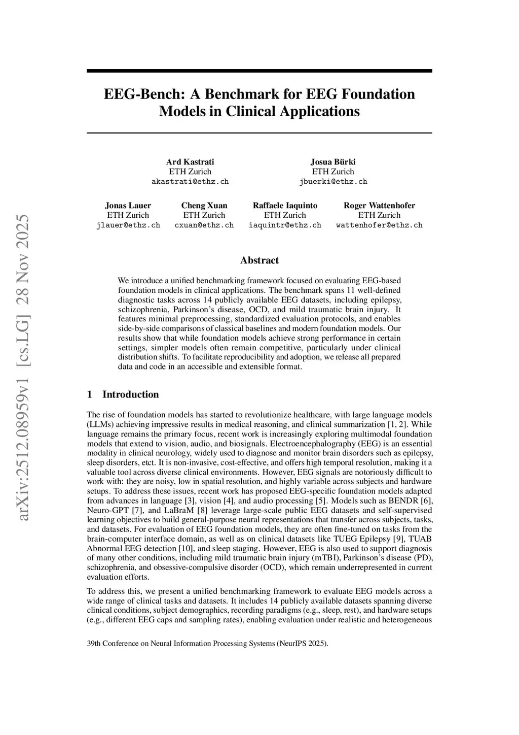 We introduce a unified benchmarking framework focused on evaluating EEG-based foundation models in clinical applications. The benchmark spans 11 well-defined diagnostic tasks across 14 publicly available EEG datasets, including epilepsy, schizophrenia, Parkinson's disease, OCD, and mild traumatic brain injury. It features minimal preprocessing, standardized evaluation protocols, and enables side-by-side comparisons of classical baselines and modern foundation models. Our results show that while foundation models achieve strong performance in certain settings, simpler models often remain competitive, particularly under clinical distribution shifts. To facilitate reproducibility and adoption, we release all prepared data and code in an accessible and extensible format.