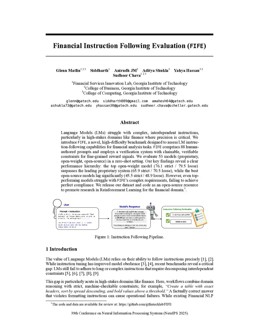 Language Models (LMs) struggle with complex, interdependent instructions, particularly in high-stakes domains like finance where precision is critical. We introduce FIFE, a novel, high-difficulty benchmark designed to assess LM instruction-following capabilities for financial analysis tasks. FIFE comprises 88 human-authored prompts and employs a verification system with chainable, verifiable constraints for fine-grained reward signals. We evaluate 53 models (proprietary, open-weight, open-source) in a zero-shot setting. Our key findings reveal a clear performance hierarchy: the top open-weight model (76.1 strict / 79.5 loose) surpasses the leading proprietary system (65.9 strict / 70.5 loose), while the best open-source models lag significantly (45.5 strict / 48.9 loose). However, even top-performing models struggle with FIFE's complex requirements, failing to achieve perfect compliance. We release our dataset and code as an open-source resource to promote research in Reinforcement Learning for the financial domain.