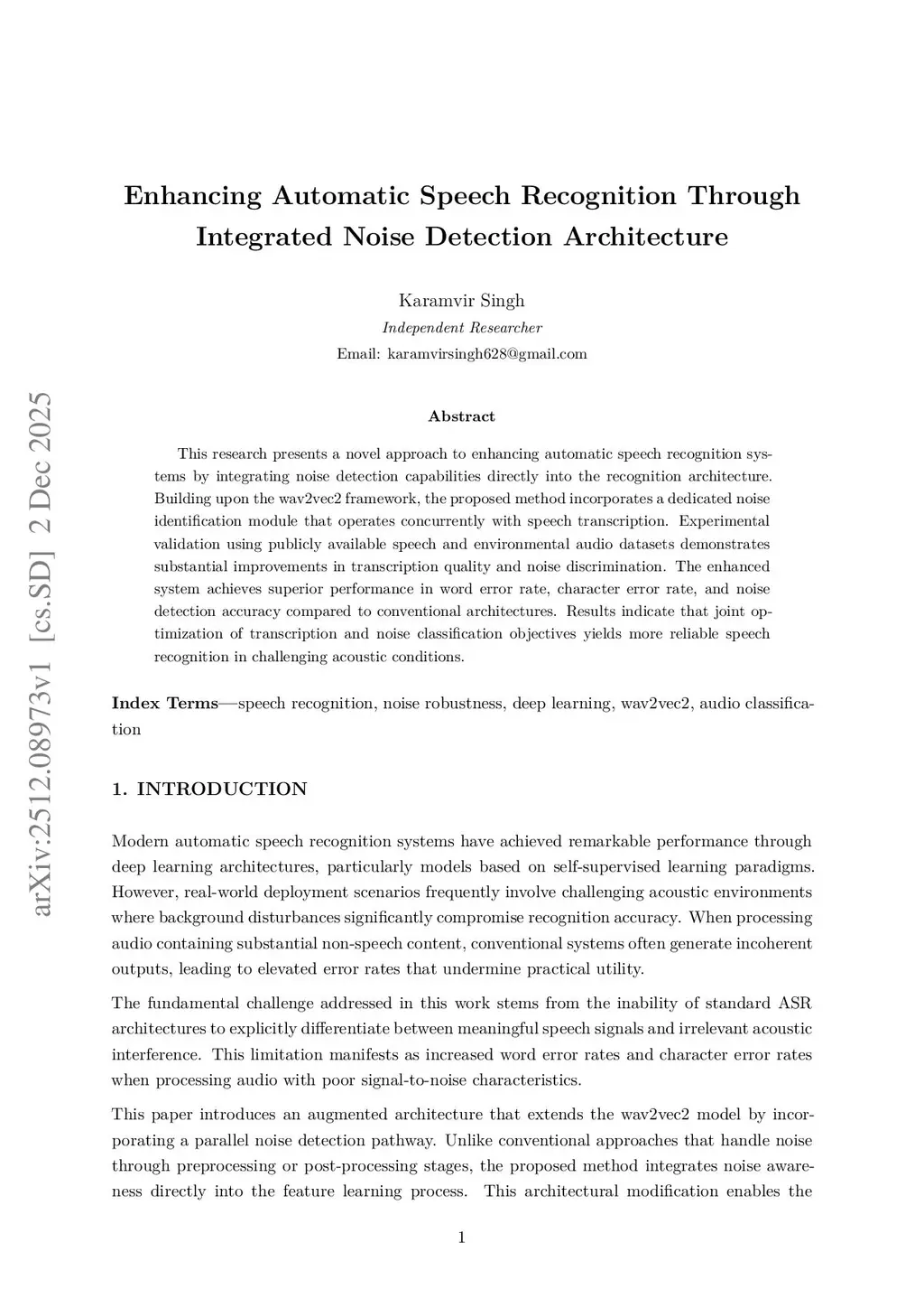 This research presents a novel approach to enhancing automatic speech recognition systems by integrating noise detection capabilities directly into the recognition architecture. Building upon the wav2vec2 framework, the proposed method incorporates a dedicated noise identification module that operates concurrently with speech transcription. Experimental validation using publicly available speech and environmental audio datasets demonstrates substantial improvements in transcription quality and noise discrimination. The enhanced system achieves superior performance in word error rate, character error rate, and noise detection accuracy compared to conventional architectures. Results indicate that joint optimization of transcription and noise classification objectives yields more reliable speech recognition in challenging acoustic conditions.