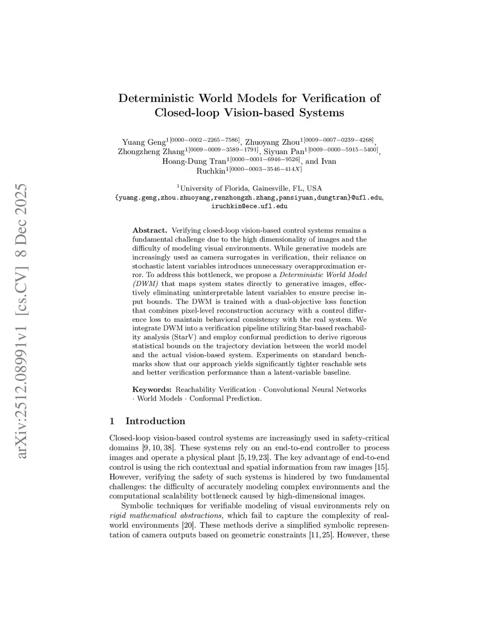 Verifying closed-loop vision-based control systems remains a fundamental challenge due to the high dimensionality of images and the difficulty of modeling visual environments. While generative models are increasingly used as camera surrogates in verification, their reliance on stochastic latent variables introduces unnecessary overapproximation error. To address this bottleneck, we propose a Deterministic World Model (DWM) that maps system states directly to generative images, effectively eliminating uninterpretable latent variables to ensure precise input bounds. The DWM is trained with a dual-objective loss function that combines pixel-level reconstruction accuracy with a control difference loss to maintain behavioral consistency with the real system. We integrate DWM into a verification pipeline utilizing Star-based reachability analysis (StarV) and employ conformal prediction to derive rigorous statistical bounds on the trajectory deviation between the world model and the actual vision-based system. Experiments on standard benchmarks show that our approach yields significantly tighter reachable sets and better verification performance than a latent-variable baseline.