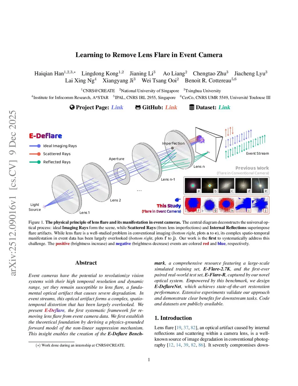 Event cameras have the potential to revolutionize vision systems with their high temporal resolution and dynamic range, yet they remain susceptible to lens flare, a fundamental optical artifact that causes severe degradation. In event streams, this optical artifact forms a complex, spatio-temporal distortion that has been largely overlooked. We present E-Deflare, the first systematic framework for removing lens flare from event camera data. We first establish the theoretical foundation by deriving a physics-grounded forward model of the non-linear suppression mechanism. This insight enables the creation of the E-Deflare Benchmark, a comprehensive resource featuring a large-scale simulated training set, E-Flare-2.7K, and the first-ever paired real-world test set, E-Flare-R, captured by our novel optical system. Empowered by this benchmark, we design E-DeflareNet, which achieves state-of-the-art restoration performance. Extensive experiments validate our approach and demonstrate clear benefits for downstream tasks. Code and datasets are publicly available.
