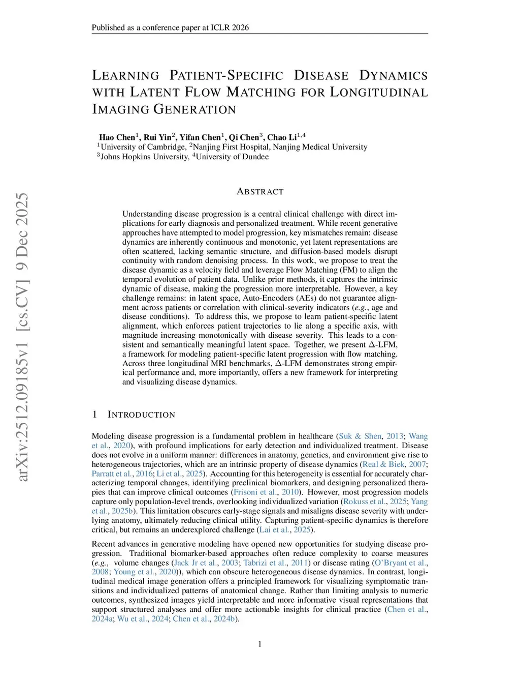 Understanding disease progression is a central clinical challenge with direct implications for early diagnosis and personalized treatment. While recent generative approaches have attempted to model progression, key mismatches remain: disease dynamics are inherently continuous and monotonic, yet latent representations are often scattered, lacking semantic structure, and diffusion-based models disrupt continuity with random denoising process. In this work, we propose to treat the disease dynamic as a velocity field and leverage Flow Matching (FM) to align the temporal evolution of patient data. Unlike prior methods, it captures the intrinsic dynamic of disease, making the progression more interpretable. However, a key challenge remains: in latent space, Auto-Encoders (AEs) do not guarantee alignment across patients or correlation with clinical-severity indicators (e.g., age and disease conditions). To address this, we propose to learn patient-specific latent alignment, which enforces patient trajectories to lie along a specific axis, with magnitude increasing monotonically with disease severity. This leads to a consistent and semantically meaningful latent space. Together, we present -LFM, a framework for modeling patient-specific latent progression with flow matching. Across three longitudinal MRI benchmarks, -LFM demonstrates strong empirical performance and, more importantly, offers a new framework for interpreting and visualizing disease dynamics.