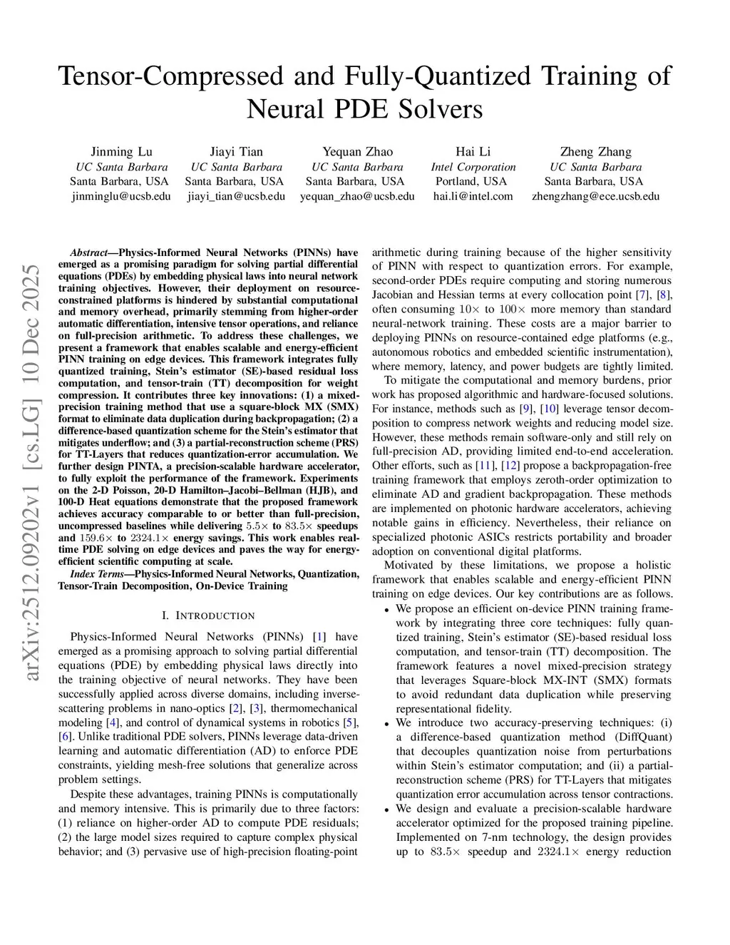 Physics-Informed Neural Networks (PINNs) have emerged as a promising paradigm for solving partial differential equations (PDEs) by embedding physical laws into neural network training objectives. However, their deployment on resource-constrained platforms is hindered by substantial computational and memory overhead, primarily stemming from higher-order automatic differentiation, intensive tensor operations, and reliance on full-precision arithmetic. To address these challenges, we present a framework that enables scalable and energy-efficient PINN training on edge devices. This framework integrates fully quantized training, Stein's estimator (SE)-based residual loss computation, and tensor-train (TT) decomposition for weight compression. It contributes three key innovations: (1) a mixed-precision training method that use a square-block MX (SMX) format to eliminate data duplication during backpropagation; (2) a difference-based quantization scheme for the Stein's estimator that mitigates underflow; and (3) a partial-reconstruction scheme (PRS) for TT-Layers that reduces quantization-error accumulation. We further design PINTA, a precision-scalable hardware accelerator, to fully exploit the performance of the framework. Experiments on the 2-D Poisson, 20-D Hamilton-Jacobi-Bellman (HJB), and 100-D Heat equations demonstrate that the proposed framework achieves accuracy comparable to or better than full-precision, uncompressed baselines while delivering 5.5x to 83.5x speedups and 159.6x to 2324.1x energy savings. This work enables real-time PDE solving on edge devices and paves the way for energy-efficient scientific computing at scale.