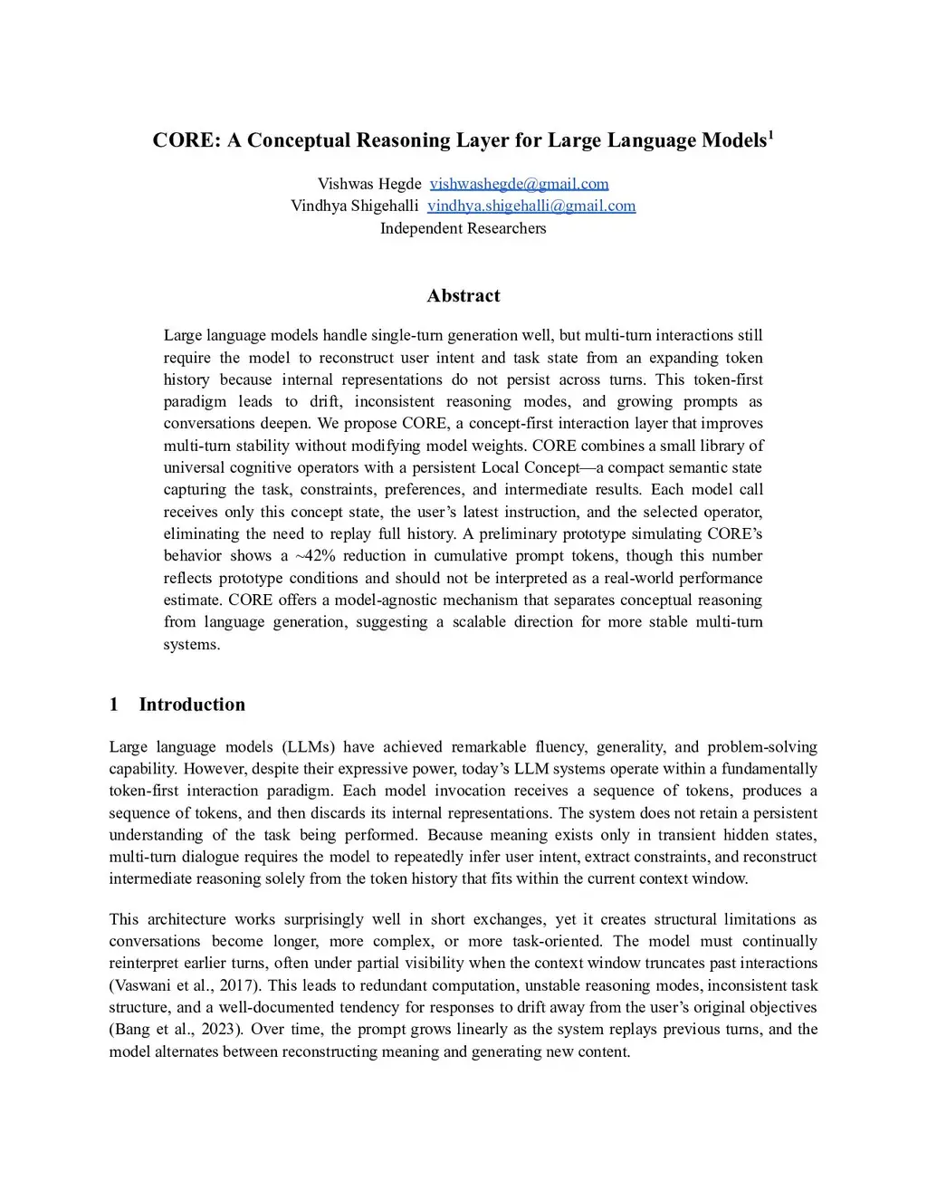 Large language models handle single-turn generation well, but multi-turn interactions still require the model to reconstruct user intent and task state from an expanding token history because internal representations do not persist across turns. This token-first paradigm leads to drift, inconsistent reasoning modes, and growing prompts as conversations deepen. We propose CORE, a concept-first interaction layer that improves multi-turn stability without modifying model weights. CORE combines a small library of universal cognitive operators with a persistent Local Concept - a compact semantic state capturing the task, constraints, preferences, and intermediate results. Each model call receives only this concept state, the user's latest instruction, and the selected operator, eliminating the need to replay full history. A preliminary prototype simulating CORE's behavior shows about 42% reduction in cumulative prompt tokens, though this number reflects prototype conditions and should not be interpreted as a real-world performance estimate. CORE offers a model-agnostic mechanism that separates conceptual reasoning from language generation, suggesting a scalable direction for more stable multi-turn systems.