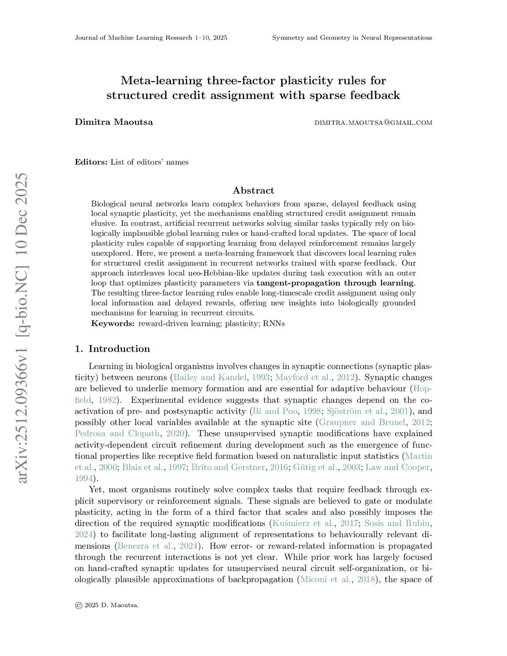 Biological neural networks learn complex behaviors from sparse, delayed feedback using local synaptic plasticity, yet the mechanisms enabling structured credit assignment remain elusive. In contrast, artificial recurrent networks solving similar tasks typically rely on biologically implausible global learning rules or hand-crafted local updates. The space of local plasticity rules capable of supporting learning from delayed reinforcement remains largely unexplored. Here, we present a meta-learning framework that discovers local learning rules for structured credit assignment in recurrent networks trained with sparse feedback. Our approach interleaves local neo-Hebbian-like updates during task execution with an outer loop that optimizes plasticity parameters via \textbf{tangent-propagation through learning}. The resulting three-factor learning rules enable long-timescale credit assignment using only local information and delayed rewards, offering new insights into biologically grounded mechanisms for learning in recurrent circuits.