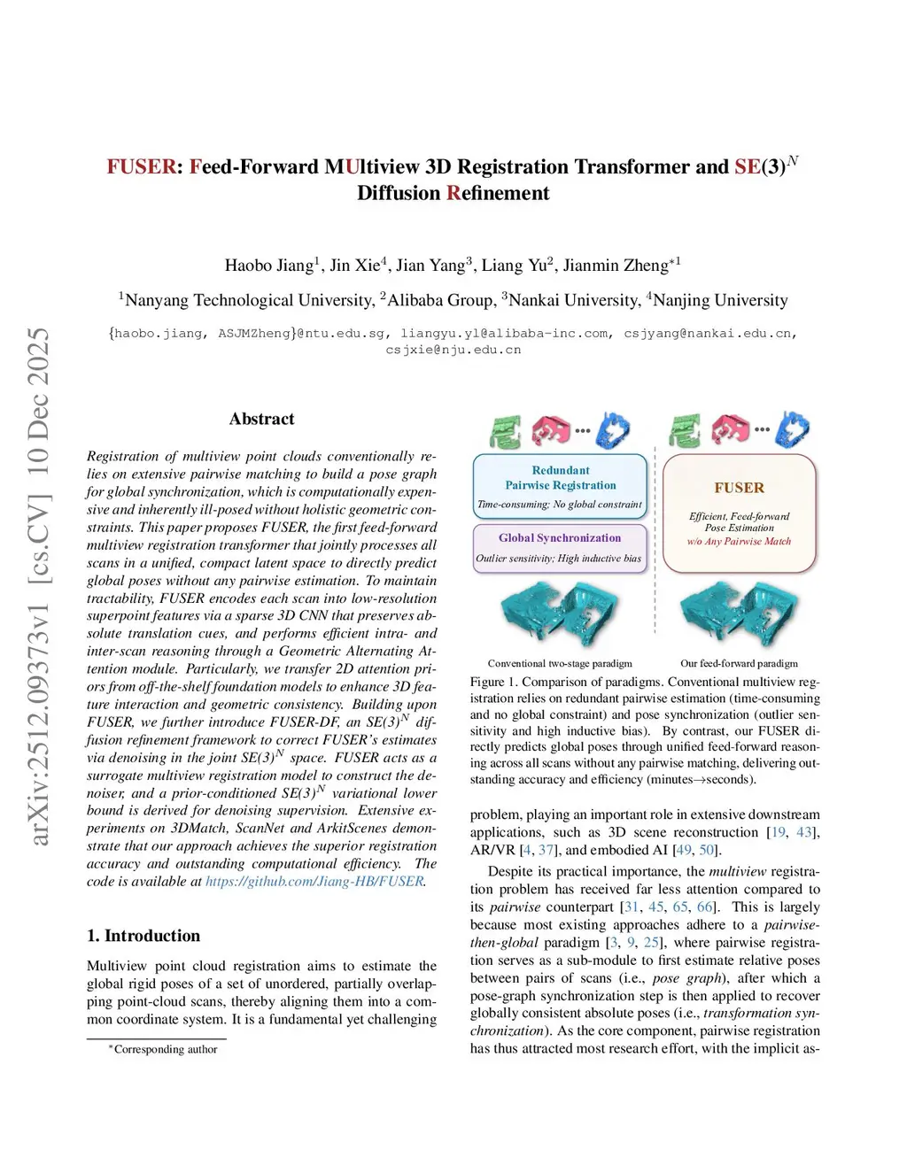 Registration of multiview point clouds conventionally relies on extensive pairwise matching to build a pose graph for global synchronization, which is computationally expensive and inherently ill-posed without holistic geometric constraints. This paper proposes FUSER, the first feed-forward multiview registration transformer that jointly processes all scans in a unified, compact latent space to directly predict global poses without any pairwise estimation. To maintain tractability, FUSER encodes each scan into low-resolution superpoint features via a sparse 3D CNN that preserves absolute translation cues, and performs efficient intra- and inter-scan reasoning through a Geometric Alternating Attention module. Particularly, we transfer 2D attention priors from off-the-shelf foundation models to enhance 3D feature interaction and geometric consistency. Building upon FUSER, we further introduce FUSER-DF, an SE(3) diffusion refinement framework to correct FUSER's estimates via denoising in the joint SE(3) space. FUSER acts as a surrogate multiview registration model to construct the denoiser, and a prior-conditioned SE(3) variational lower bound is derived for denoising supervision. Extensive experiments on 3DMatch, ScanNet and ArkitScenes demonstrate that our approach achieves the superior registration accuracy and outstanding computational efficiency.