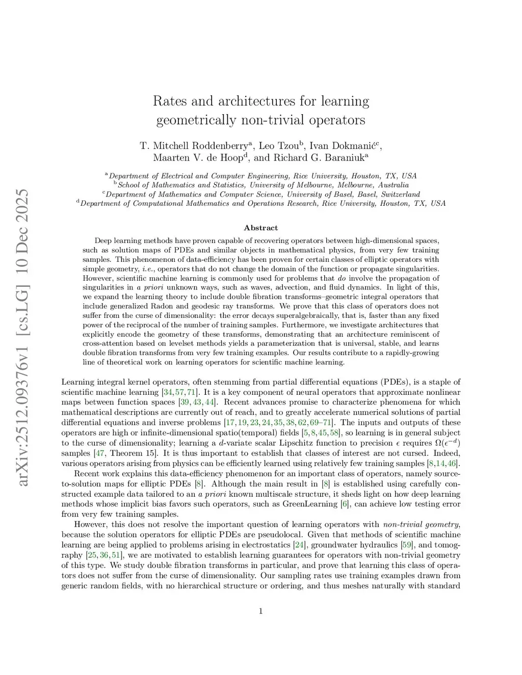 Deep learning methods have proven capable of recovering operators between high-dimensional spaces, such as solution maps of PDEs and similar objects in mathematical physics, from very few training samples. This phenomenon of data-efficiency has been proven for certain classes of elliptic operators with simple geometry, i.e., operators that do not change the domain of the function or propagate singularities. However, scientific machine learning is commonly used for problems that do involve the propagation of singularities in a priori unknown ways, such as waves, advection, and fluid dynamics. In light of this, we expand the learning theory to include double fibration transforms--geometric integral operators that include generalized Radon and geodesic ray transforms. We prove that this class of operators does not suffer from the curse of dimensionality: the error decays superalgebraically, that is, faster than any fixed power of the reciprocal of the number of training samples. Furthermore, we investigate architectures that explicitly encode the geometry of these transforms, demonstrating that an architecture reminiscent of cross-attention based on levelset methods yields a parameterization that is universal, stable, and learns double fibration transforms from very few training examples. Our results contribute to a rapidly-growing line of theoretical work on learning operators for scientific machine learning.