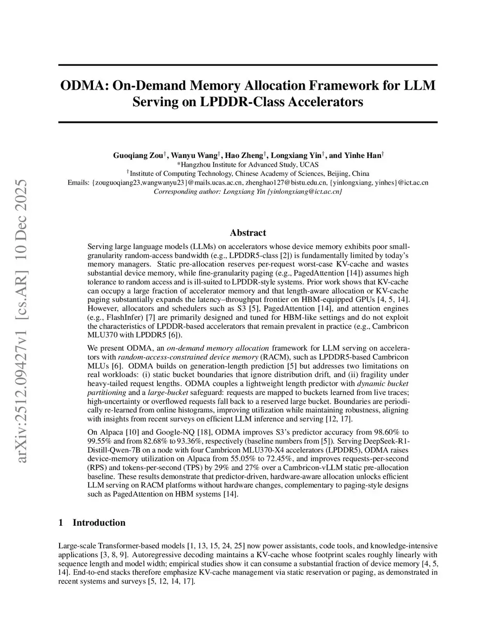 Existing memory management techniques severely hinder efficient Large Language Model serving on accelerators constrained by poor random-accessthis http URLstatic pre-allocation preserves memory contiguity,it incurs significant overhead due to worst-casethis http URL,fine-grained paging mitigates this overhead but relies on HBM's high random-access tolerance, making it unsuitable for LPDDR systems where non-sequential access rapidly degrades bandwidth. Furthermore, prior works typically assume static distributions and HBM characteristics, thereby failing to resolve the critical fragmentation and bandwidth constraints inherent to LPDDR hardware. We present ODMA, an on-demand memory allocation strategy tailored for random-access-constrained accelerators, such as the Cambricon MLUthis http URLadvances generation-length prediction by addressing two critical limitations in production workloads: (i) distribution drift that invalidates static bucket boundaries, and (ii) performance fragility under heavy-tailed request patterns. ODMA integrates a lightweight length predictor with adaptive bucket partitioning and a fallback safety pool. Bucket boundaries are dynamically recalibrated via online histograms to maximize utilization, while the safety pool ensures robustness against prediction errors. On Alpaca and Google-NQ benchmarks, ODMA improves S3's prediction accuracy from 98.60% to 99.55% and 82.68% to 93.36%, respectively. Deployment with DeepSeek-R1-Distill-Qwen-7B on Cambricon MLU370-X4 accelerators demonstrates that ODMA increases KV-cache utilization by up to 19.25% (absolute) and throughput (TPS) by 23-27% over static baselines, validating the efficacy of predictor-driven contiguous allocation for LPDDR-class devices.