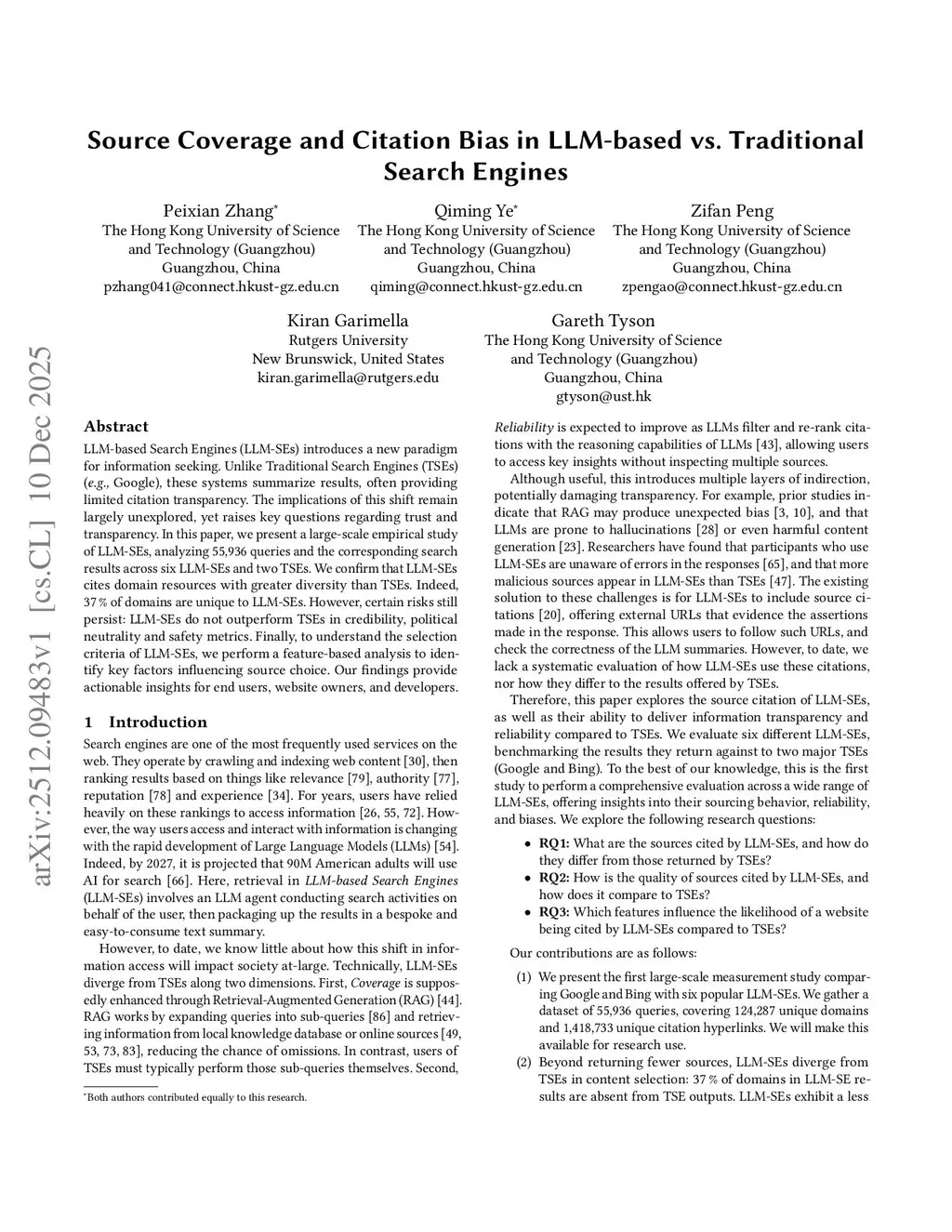 LLM-based Search Engines (LLM-SEs) introduces a new paradigm for information seeking. Unlike Traditional Search Engines (TSEs) (e.g., Google), these systems summarize results, often providing limited citation transparency. The implications of this shift remain largely unexplored, yet raises key questions regarding trust and transparency. In this paper, we present a large-scale empirical study of LLM-SEs, analyzing 55,936 queries and the corresponding search results across six LLM-SEs and two TSEs. We confirm that LLM-SEs cites domain resources with greater diversity than TSEs. Indeed, 37% of domains are unique to LLM-SEs. However, certain risks still persist: LLM-SEs do not outperform TSEs in credibility, political neutrality and safety metrics. Finally, to understand the selection criteria of LLM-SEs, we perform a feature-based analysis to identify key factors influencing source choice. Our findings provide actionable insights for end users, website owners, and developers.