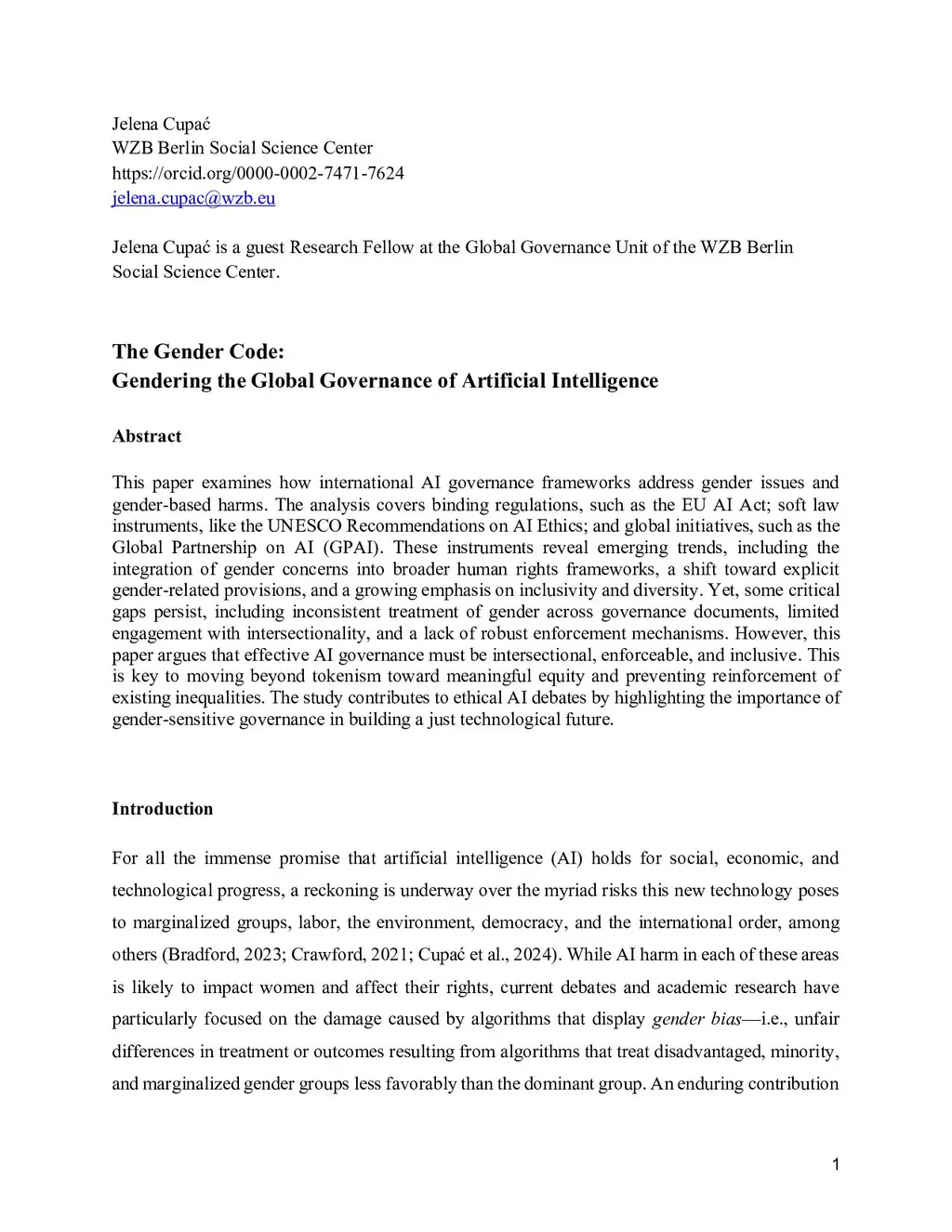 The Gender Code: Gendering the Global Governance of Artificial Intelligence