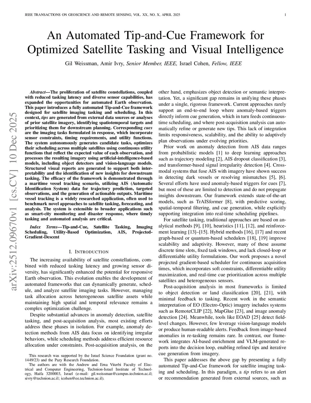 The proliferation of satellite constellations, coupled with reduced tasking latency and diverse sensor capabilities, has expanded the opportunities for automated Earth observation. This paper introduces a fully automated Tip-and-Cue framework designed for satellite imaging tasking and scheduling. In this context, tips are generated from external data sources or analyses of prior satellite imagery, identifying spatiotemporal targets and prioritizing them for downstream planning. Corresponding cues are the imaging tasks formulated in response, which incorporate sensor constraints, timing requirements, and utility functions. The system autonomously generates candidate tasks, optimizes their scheduling across multiple satellites using continuous utility functions that reflect the expected value of each observation, and processes the resulting imagery using artificial-intelligence-based models, including object detectors and vision-language models. Structured visual reports are generated to support both interpretability and the identification of new insights for downstream tasking. The efficacy of the framework is demonstrated through a maritime vessel tracking scenario, utilizing Automatic Identification System (AIS) data for trajectory prediction, targeted observations, and the generation of actionable outputs. Maritime vessel tracking is a widely researched application, often used to benchmark novel approaches to satellite tasking, forecasting, and analysis. The system is extensible to broader applications such as smart-city monitoring and disaster response, where timely tasking and automated analysis are critical.