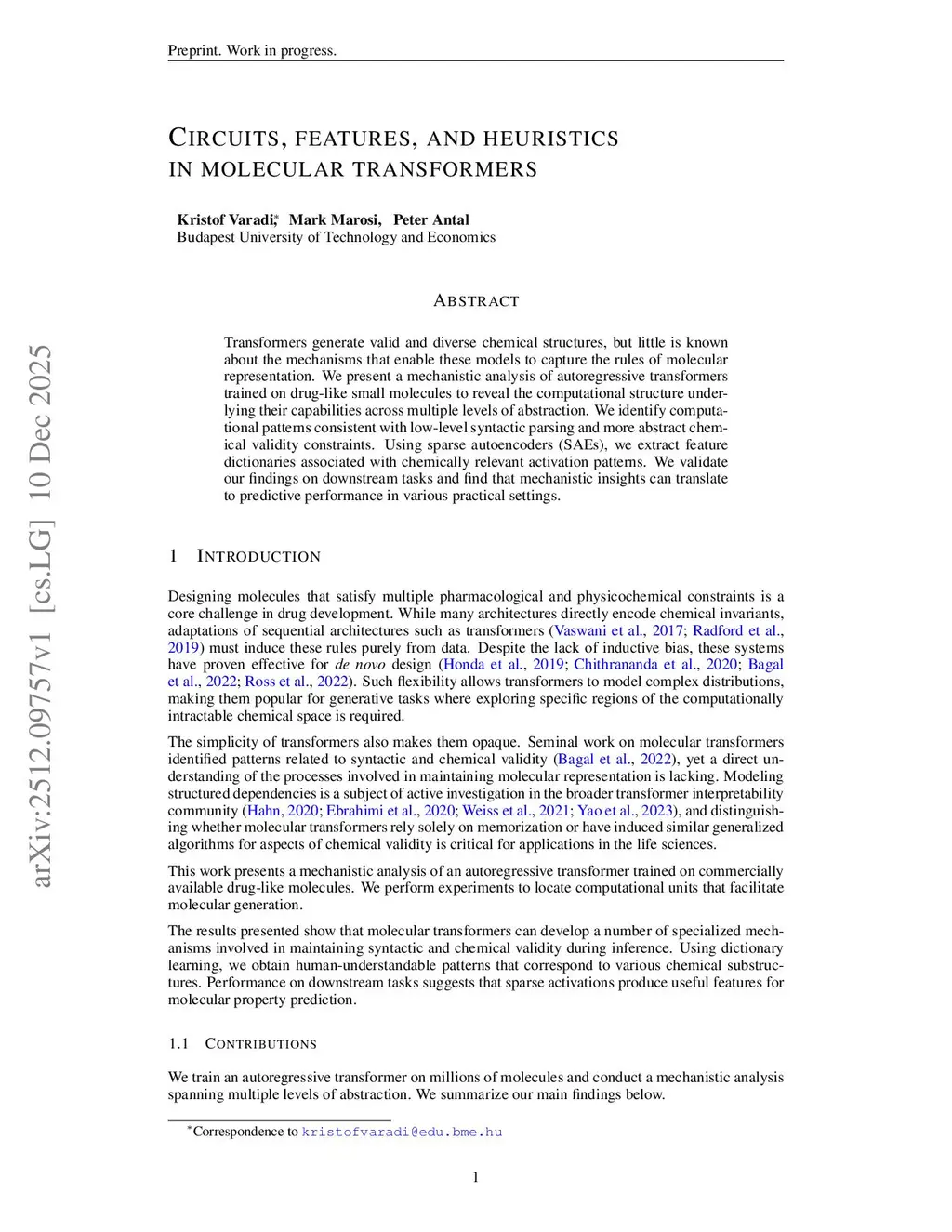 Transformers generate valid and diverse chemical structures, but little is known about the mechanisms that enable these models to capture the rules of molecular representation. We present a mechanistic analysis of autoregressive transformers trained on drug-like small molecules to reveal the computational structure underlying their capabilities across multiple levels of abstraction. We identify computational patterns consistent with low-level syntactic parsing and more abstract chemical validity constraints. Using sparse autoencoders (SAEs), we extract feature dictionaries associated with chemically relevant activation patterns. We validate our findings on downstream tasks and find that mechanistic insights can translate to predictive performance in various practical settings.