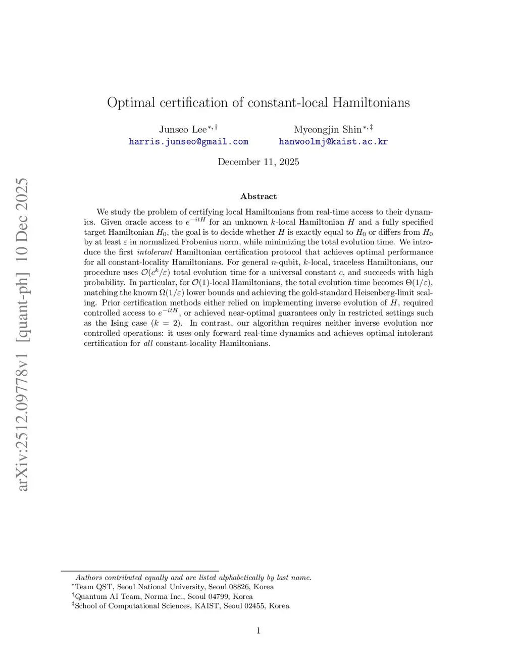 We study the problem of certifying local Hamiltonians from real-time access to their dynamics. Given oracle access to for an unknown -local Hamiltonian and a fully specified target Hamiltonian , the goal is to decide whether is exactly equal to or differs from by at least in normalized Frobenius norm, while minimizing the total evolution time. We introduce the first intolerant Hamiltonian certification protocol that achieves optimal performance for all constant-locality Hamiltonians. For general -qubit, -local, traceless Hamiltonians, our procedure uses total evolution time for a universal constant , and succeeds with high probability. In particular, for -local Hamiltonians, the total evolution time becomes , matching the known lower bounds and achieving the gold-standard Heisenberg-limit scaling. Prior certification methods either relied on implementing inverse evolution of , required controlled access to , or achieved near-optimal guarantees only in restricted settings such as the Ising case (). In contrast, our algorithm requires neither inverse evolution nor controlled operations: it uses only forward real-time dynamics and achieves optimal intolerant certification for all constant-locality Hamiltonians.
