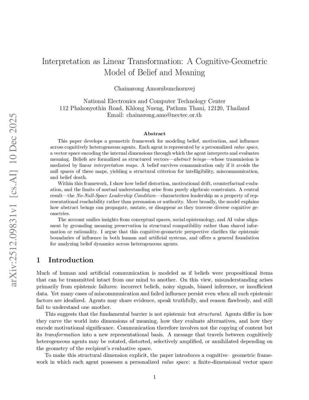 This paper develops a geometric framework for modeling belief, motivation, and influence across cognitively heterogeneous agents. Each agent is represented by a personalized value space, a vector space encoding the internal dimensions through which the agent interprets and evaluates meaning. Beliefs are formalized as structured vectors-abstract beings-whose transmission is mediated by linear interpretation maps. A belief survives communication only if it avoids the null spaces of these maps, yielding a structural criterion for intelligibility, miscommunication, and belief death.Within this framework, I show how belief distortion, motivational drift, counterfactual evaluation, and the limits of mutual understanding arise from purely algebraic constraints. A central result-"the No-Null-Space Leadership Condition"-characterizes leadership as a property of representational reachability rather than persuasion or authority. More broadly, the model explains how abstract beings can propagate, mutate, or disappear as they traverse diverse cognitive geometries.The account unifies insights from conceptual spaces, social epistemology, and AI value alignment by grounding meaning preservation in structural compatibility rather than shared information or rationality. I argue that this cognitive-geometric perspective clarifies the epistemic boundaries of influence in both human and artificial systems, and offers a general foundation for analyzing belief dynamics across heterogeneous agents.