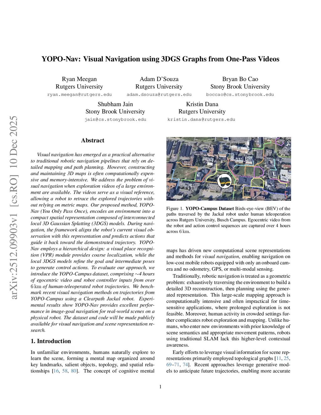 Visual navigation has emerged as a practical alternative to traditional robotic navigation pipelines that rely on detailed mapping and path planning. However, constructing and maintaining 3D maps is often computationally expensive and memory-intensive. We address the problem of visual navigation when exploration videos of a large environment are available. The videos serve as a visual reference, allowing a robot to retrace the explored trajectories without relying on metric maps. Our proposed method, YOPO-Nav (You Only Pass Once), encodes an environment into a compact spatial representation composed of interconnected local 3D Gaussian Splatting (3DGS) models. During navigation, the framework aligns the robot's current visual observation with this representation and predicts actions that guide it back toward the demonstrated trajectory. YOPO-Nav employs a hierarchical design: a visual place recognition (VPR) module provides coarse localization, while the local 3DGS models refine the goal and intermediate poses to generate control actions. To evaluate our approach, we introduce the YOPO-Campus dataset, comprising 4 hours of egocentric video and robot controller inputs from over 6 km of human-teleoperated robot trajectories. We benchmark recent visual navigation methods on trajectories from YOPO-Campus using a Clearpath Jackal robot. Experimental results show YOPO-Nav provides excellent performance in image-goal navigation for real-world scenes on a physical robot. The dataset and code will be made publicly available for visual navigation and scene representation research.