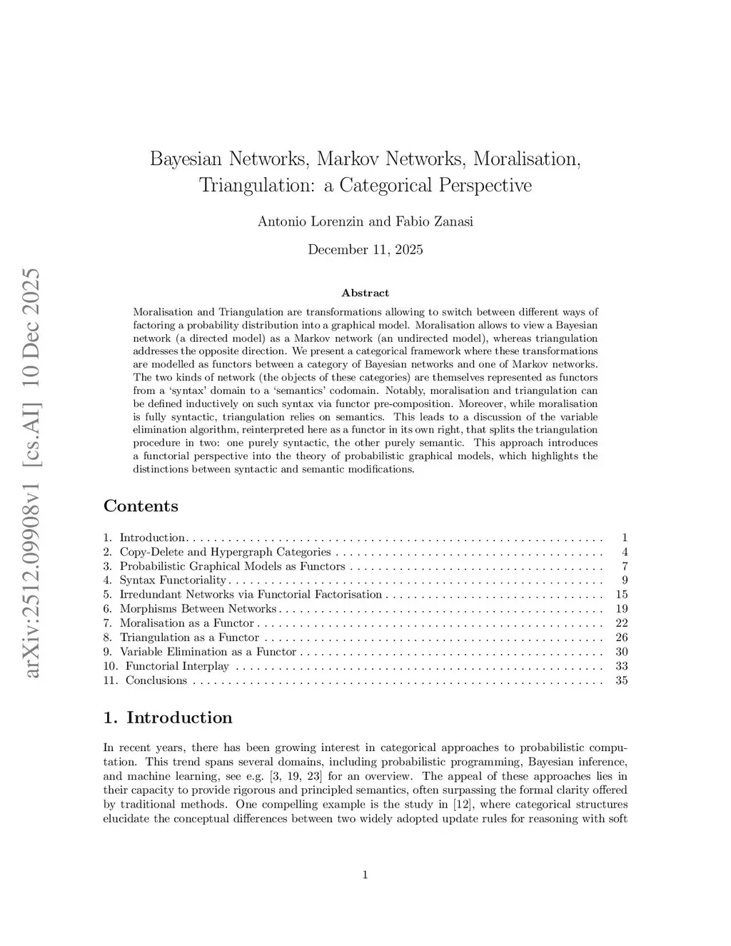 Moralisation and Triangulation are transformations allowing to switch between different ways of factoring a probability distribution into a graphical model. Moralisation allows to view a Bayesian network (a directed model) as a Markov network (an undirected model), whereas triangulation addresses the opposite direction. We present a categorical framework where these transformations are modelled as functors between a category of Bayesian networks and one of Markov networks. The two kinds of network (the objects of these categories) are themselves represented as functors from a `syntax' domain to a `semantics' codomain. Notably, moralisation and triangulation can be defined inductively on such syntax via functor pre-composition. Moreover, while moralisation is fully syntactic, triangulation relies on semantics. This leads to a discussion of the variable elimination algorithm, reinterpreted here as a functor in its own right, that splits the triangulation procedure in two: one purely syntactic, the other purely semantic. This approach introduces a functorial perspective into the theory of probabilistic graphical models, which highlights the distinctions between syntactic and semantic modifications.