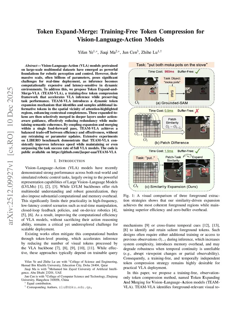 Vision-Language-Action (VLA) models pretrained on large-scale multimodal datasets have emerged as powerful foundations for robotic perception and control. However, their massive scale, often billions of parameters, poses significant challenges for real-time deployment, as inference becomes computationally expensive and latency-sensitive in dynamic environments. To address this, we propose Token Expand-and-Merge-VLA (TEAM-VLA), a training-free token compression framework that accelerates VLA inference while preserving task performance. TEAM-VLA introduces a dynamic token expansion mechanism that identifies and samples additional informative tokens in the spatial vicinity of attention-highlighted regions, enhancing contextual completeness. These expanded tokens are then selectively merged in deeper layers under action-aware guidance, effectively reducing redundancy while maintaining semantic coherence. By coupling expansion and merging within a single feed-forward pass, TEAM-VLA achieves a balanced trade-off between efficiency and effectiveness, without any retraining or parameter updates. Extensive experiments on LIBERO benchmark demonstrate that TEAM-VLA consistently improves inference speed while maintaining or even surpassing the task success rate of full VLA models. The code is public available on \href{this https URL}{this https URL}