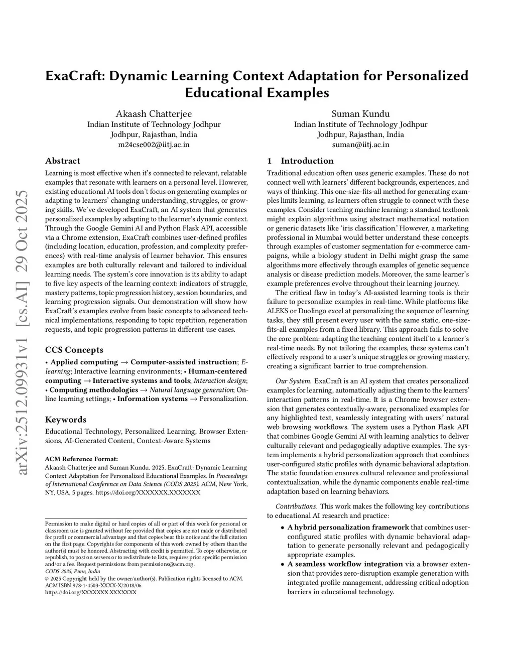 ExaCraft: Dynamic Learning Context Adaptation for Personalized Educational Examples